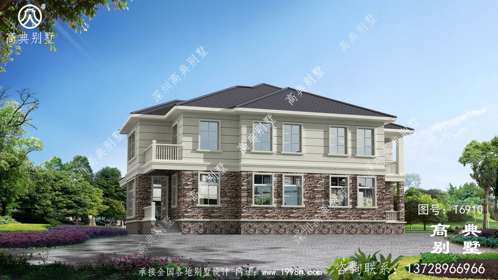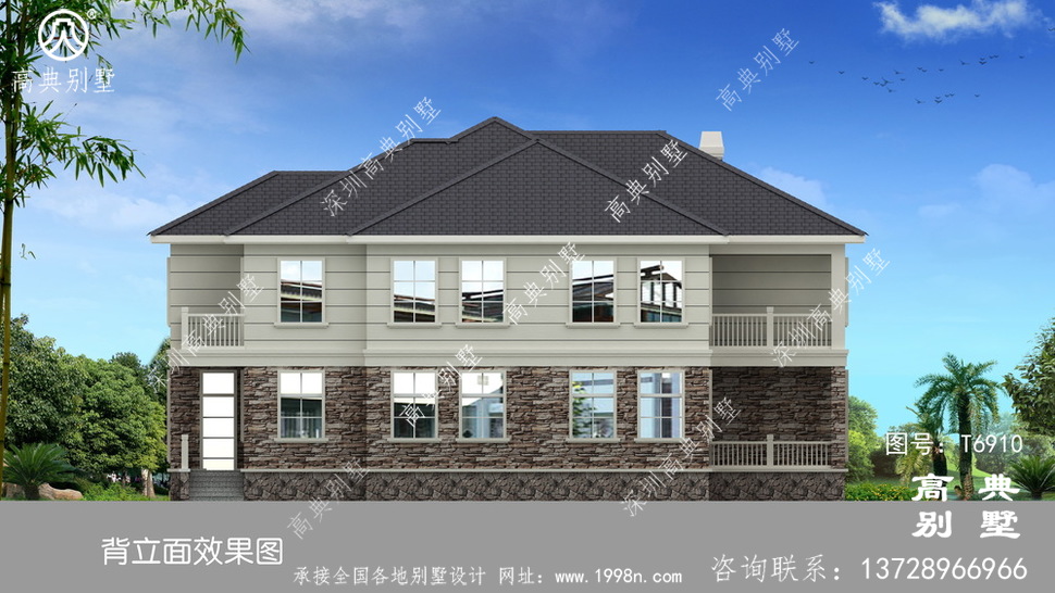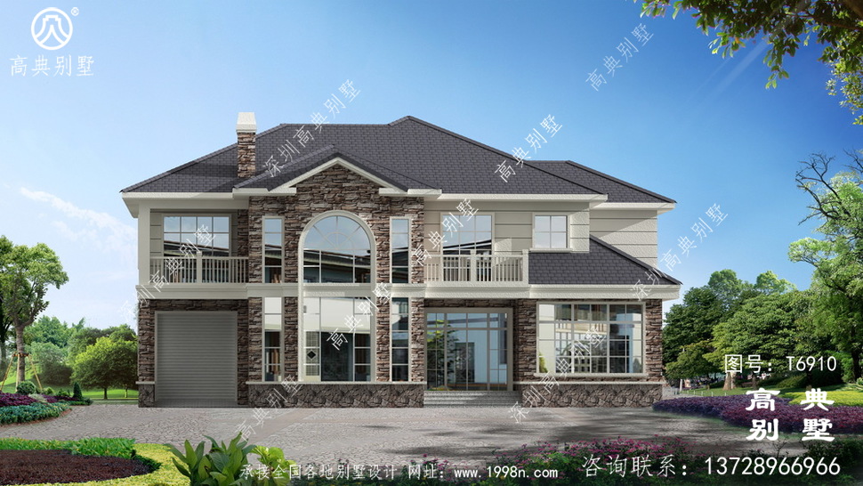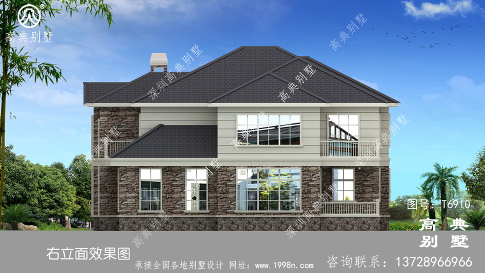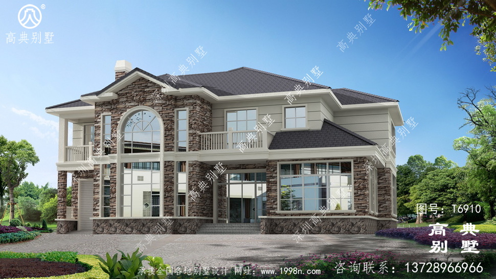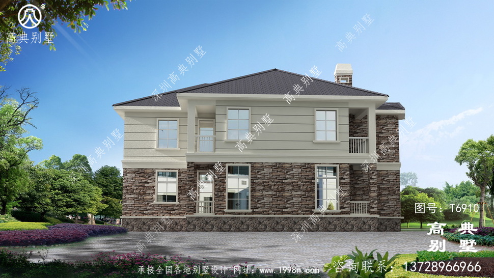 此别墅外墙主要材料:外墙涂料、屋面水泥平板瓦、实木栏杆、外墙文化石