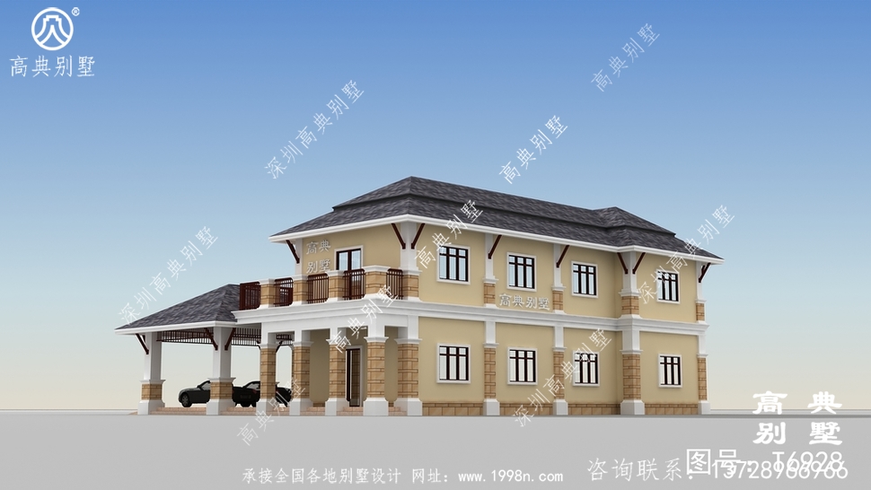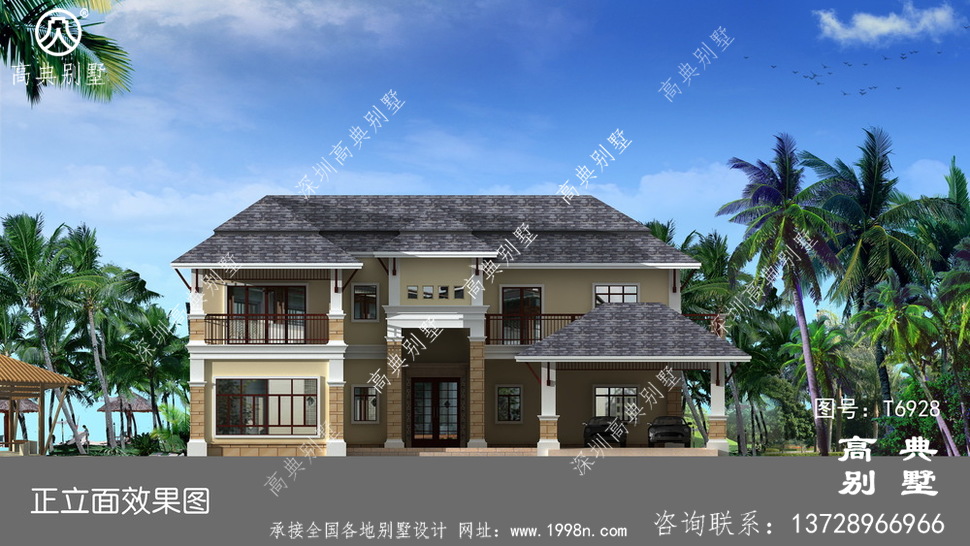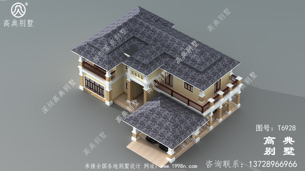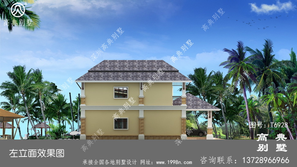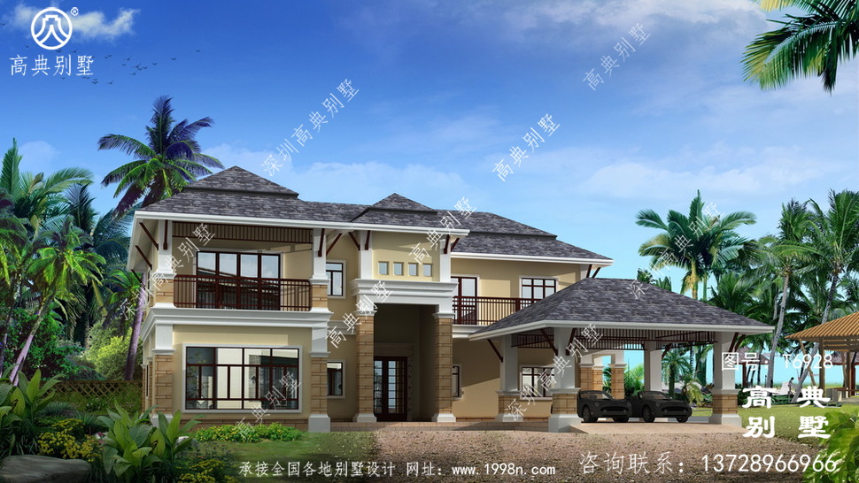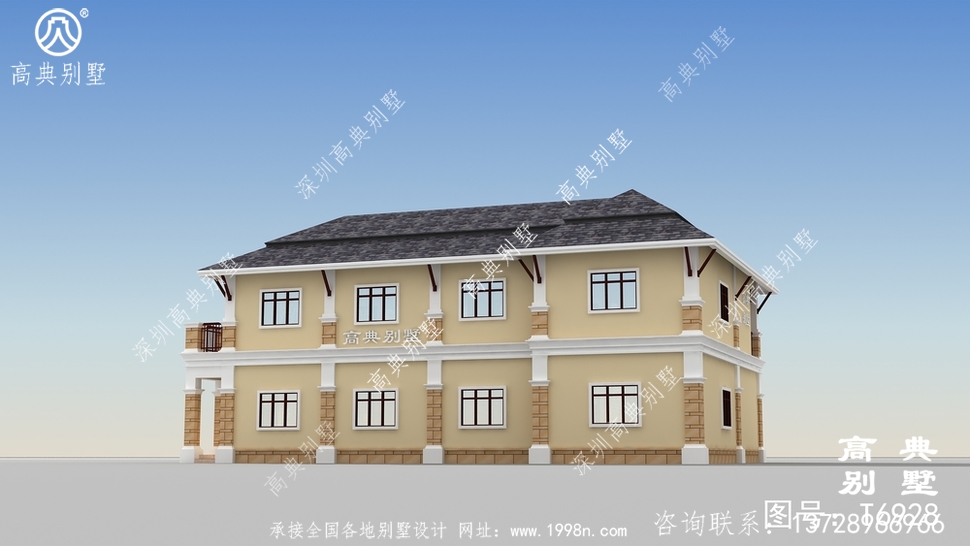 此别墅外墙主要材料:外墙涂料、屋面玻纤瓦、实木栏杆、天然砂岩石
