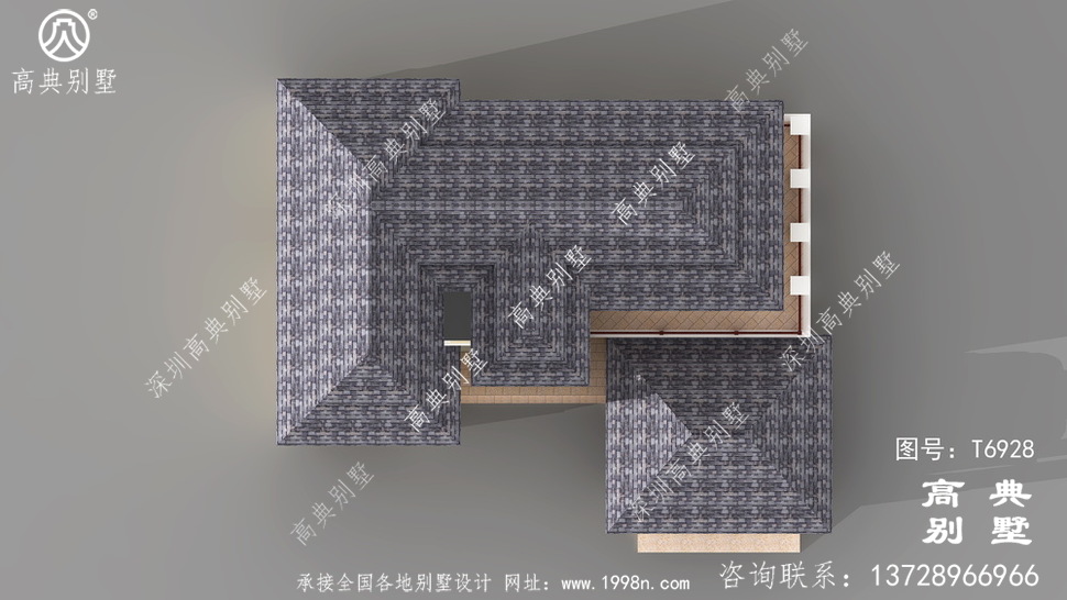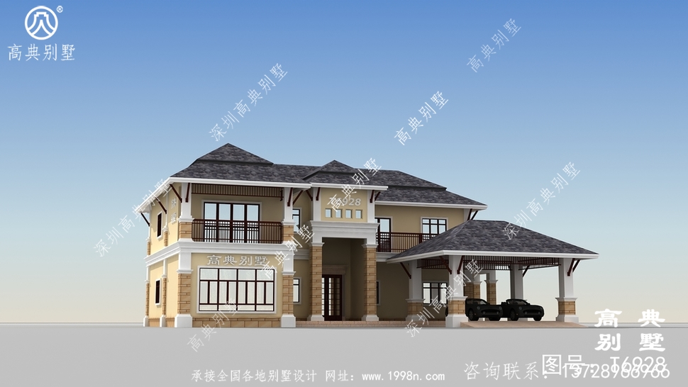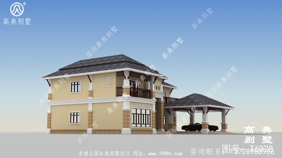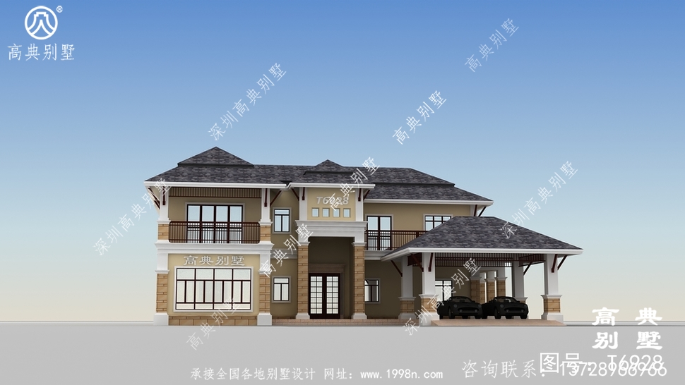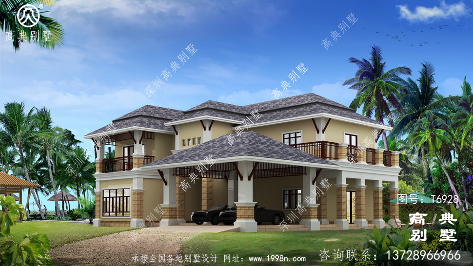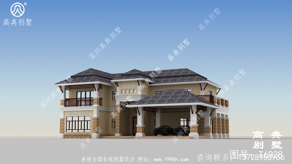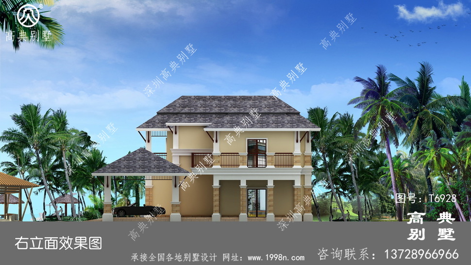 此别墅外墙主要材料:外墙涂料、屋面玻纤瓦、实木栏杆、天然砂岩石