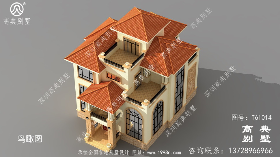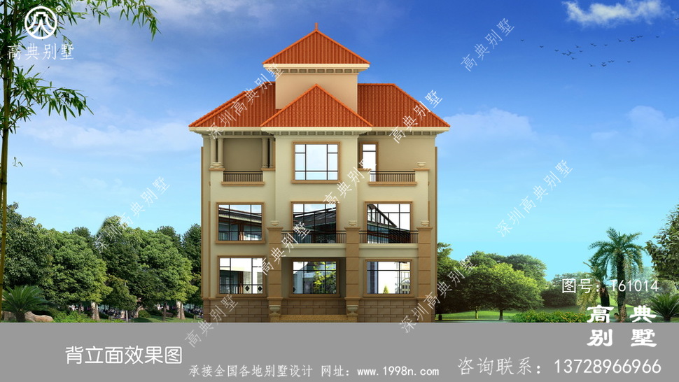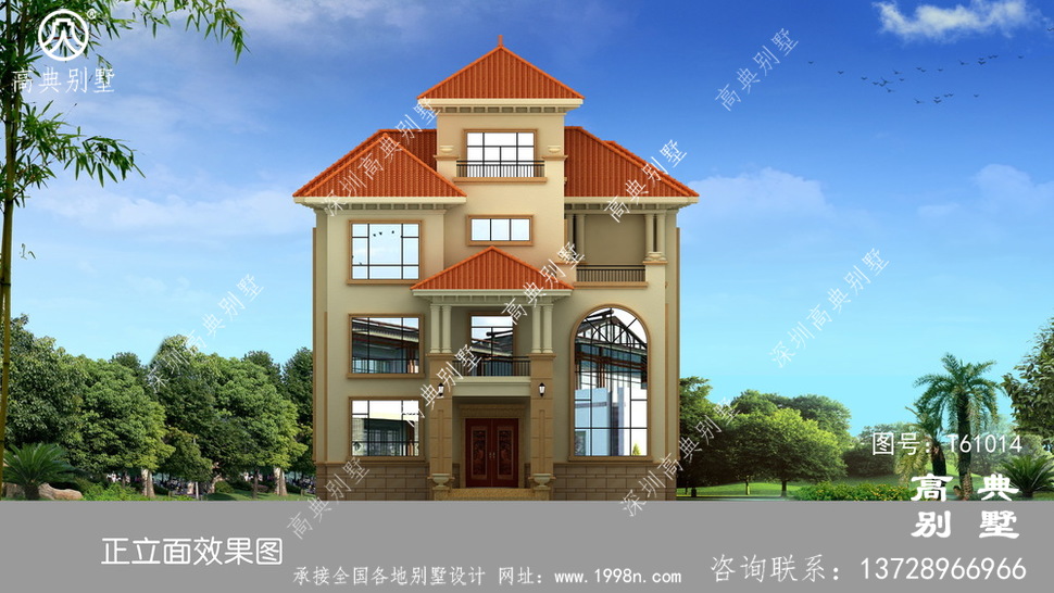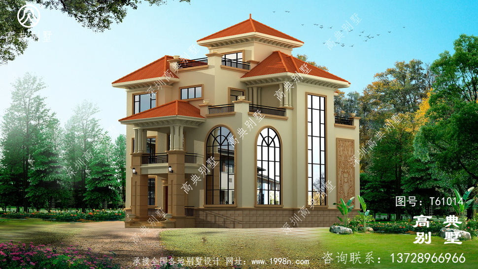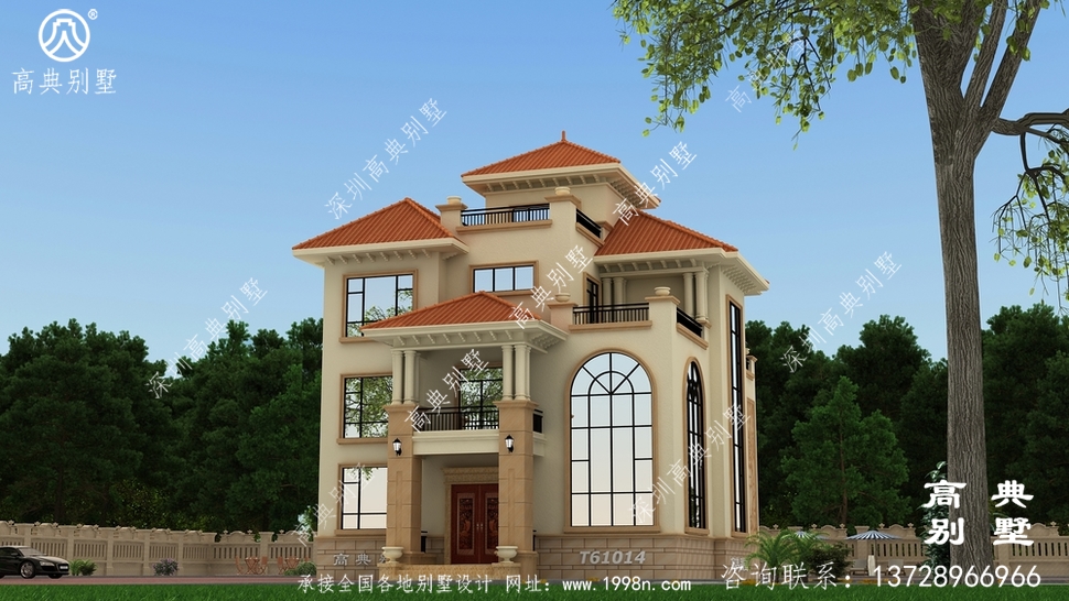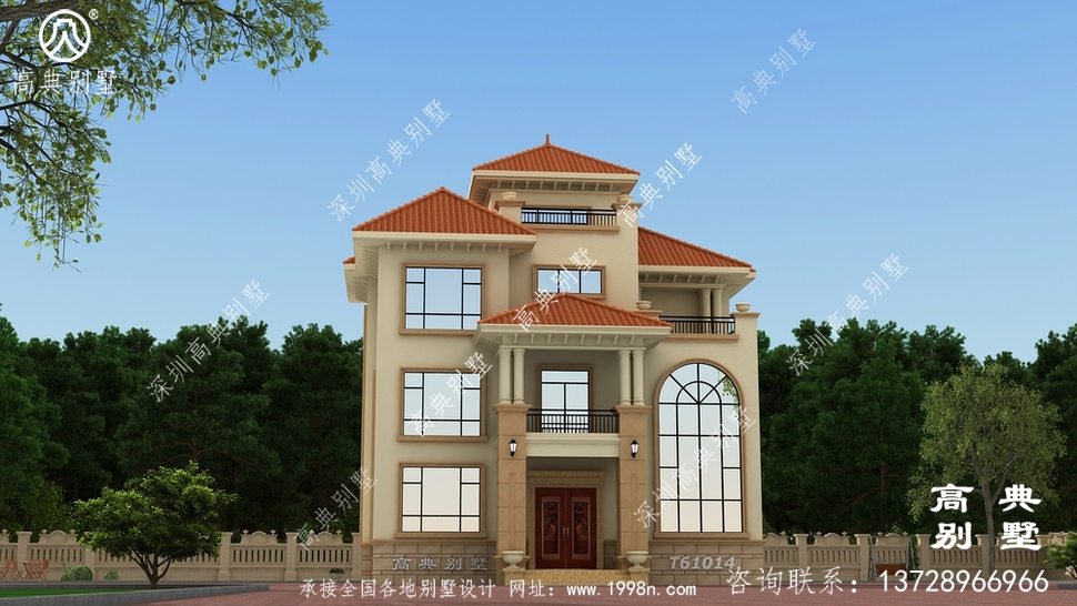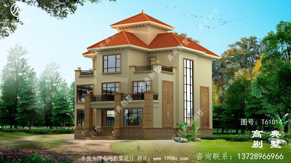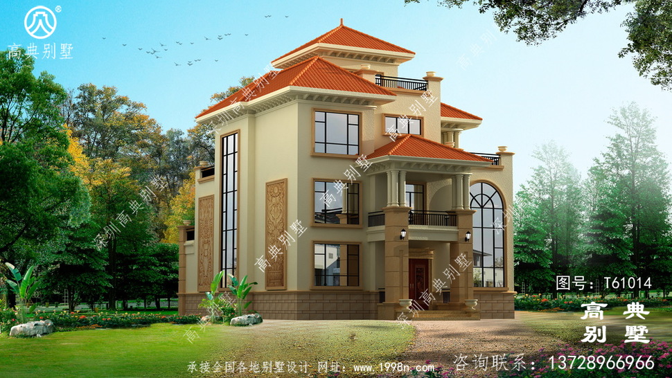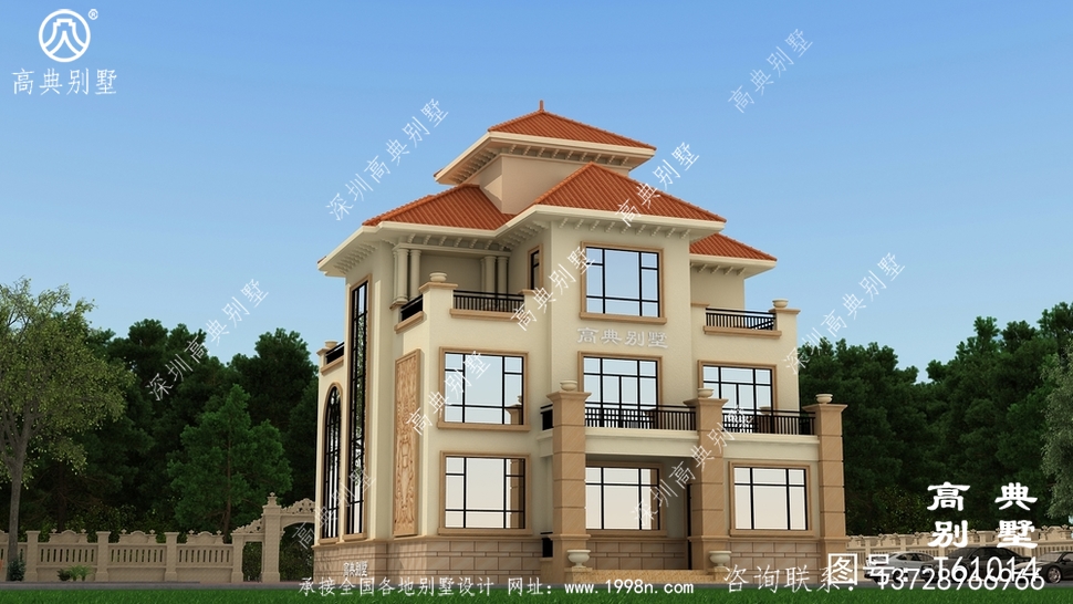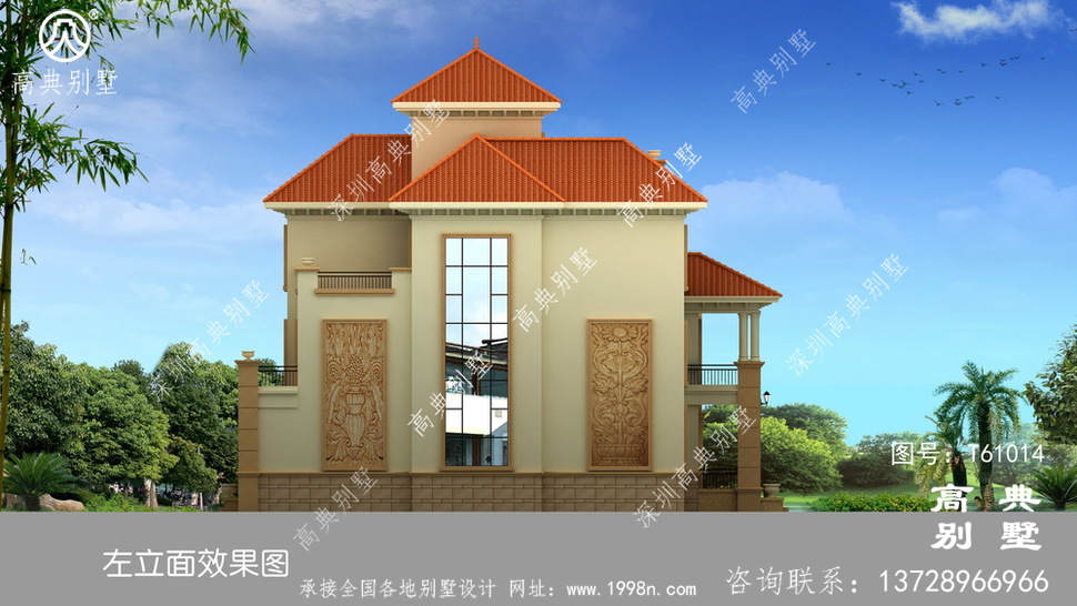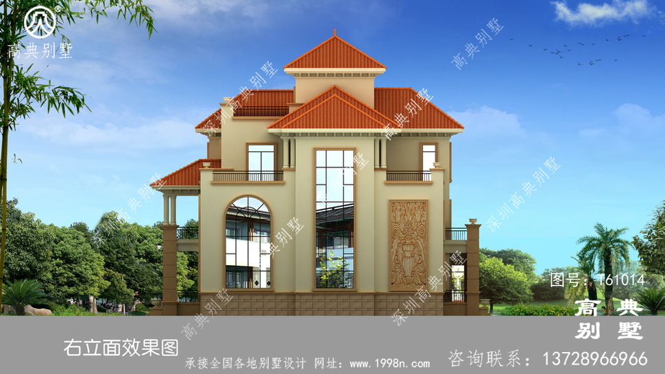 此别墅外墙主要材料:外墙涂料、西瓦、砂岩石窗套装饰线、砂岩石、铁艺栏杆