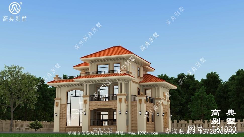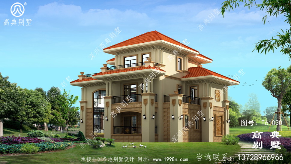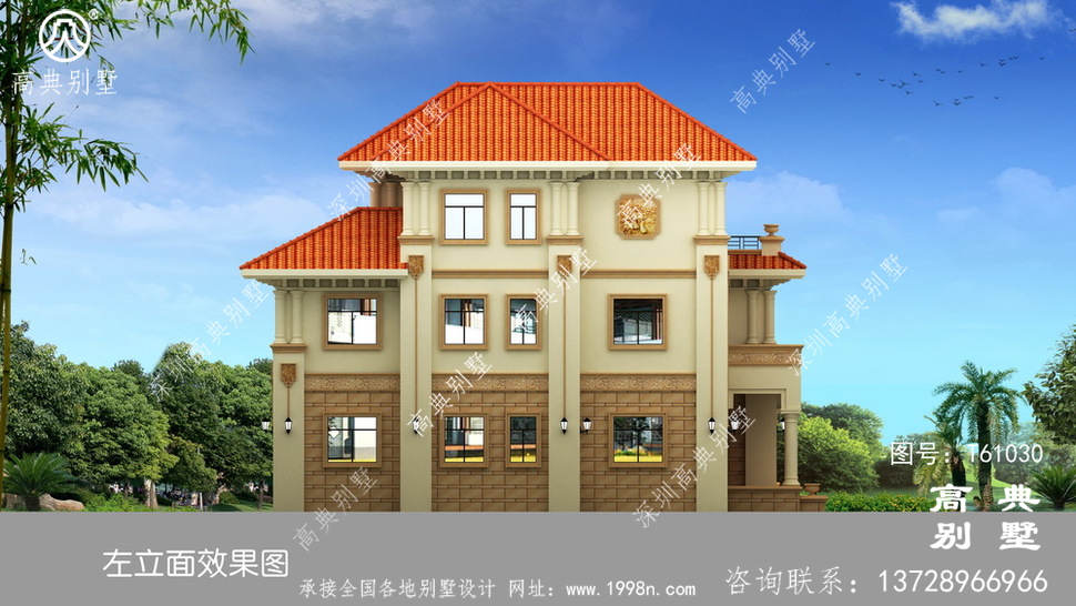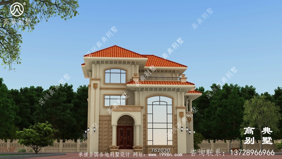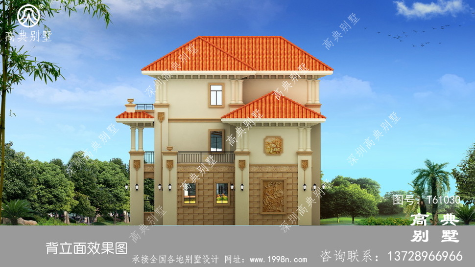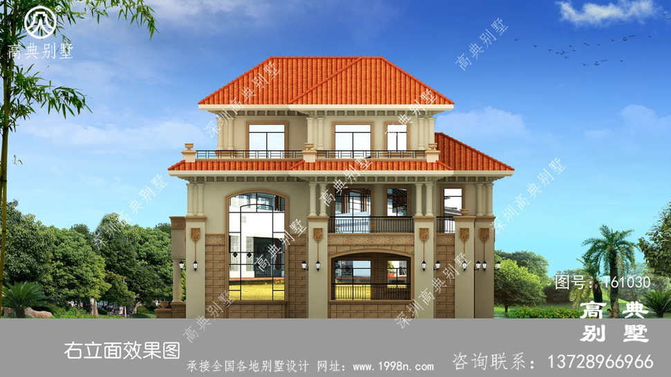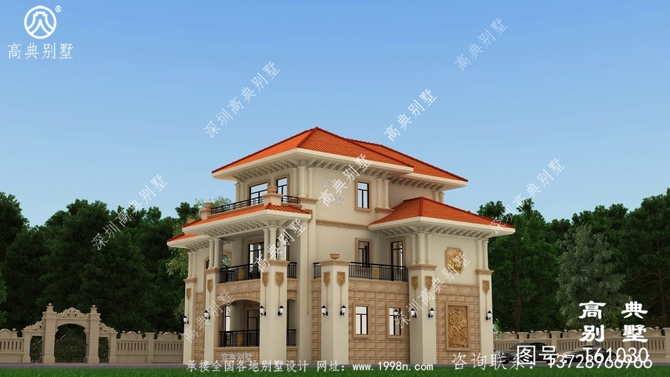 此别墅外墙材料:天然岩石漆、天然砂岩石板材、天然砂岩石浮雕、310X310 S瓦、GRC水泥构件、铁艺栏杆