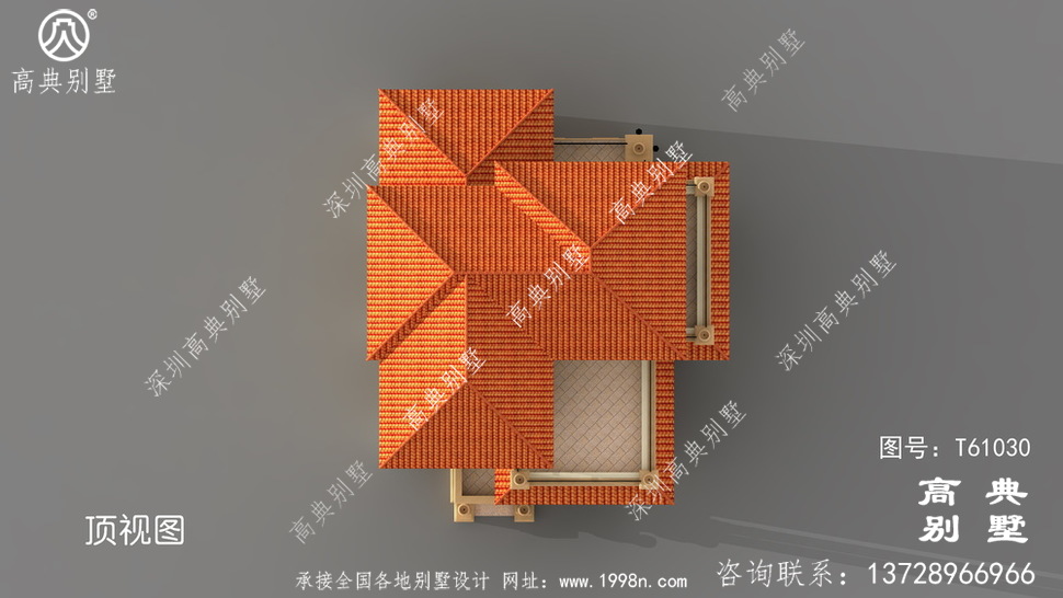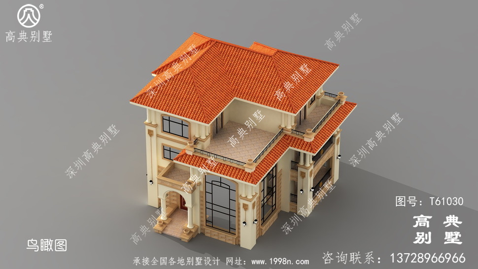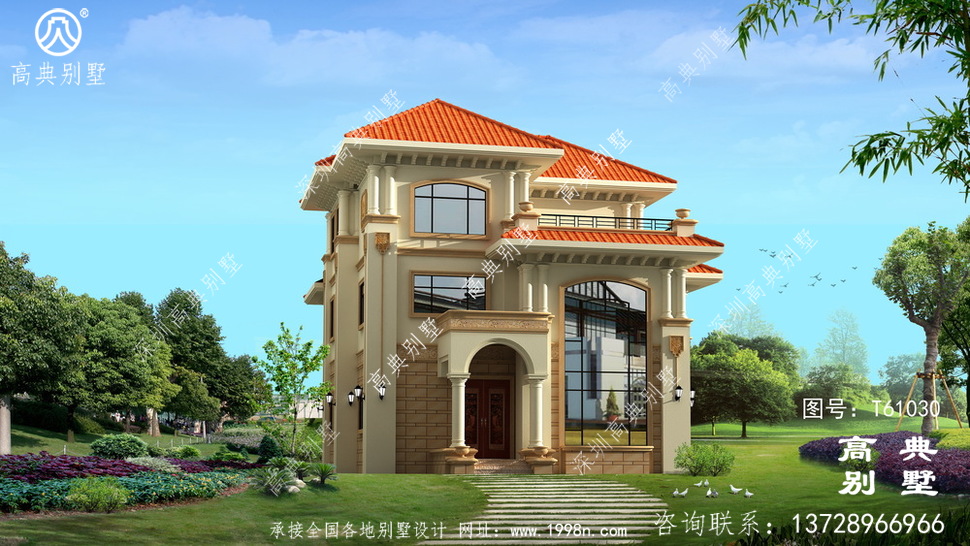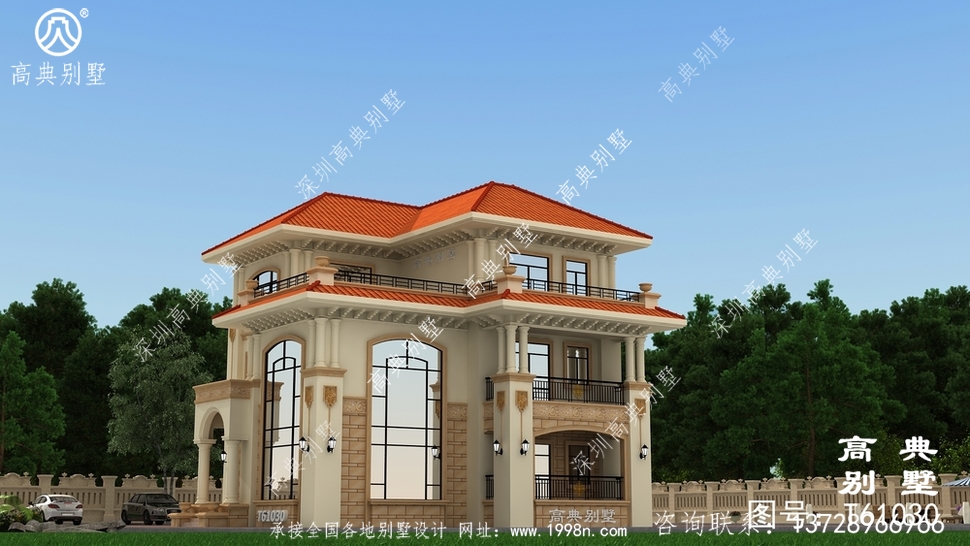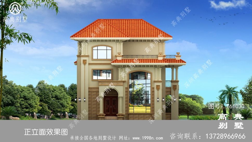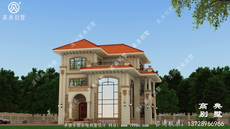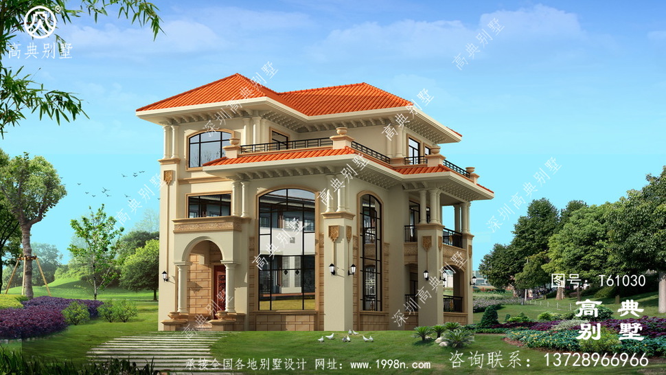 此别墅外墙材料:天然岩石漆、天然砂岩石板材、天然砂岩石浮雕、310X310 S瓦、GRC水泥构件、铁艺栏杆