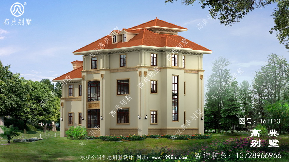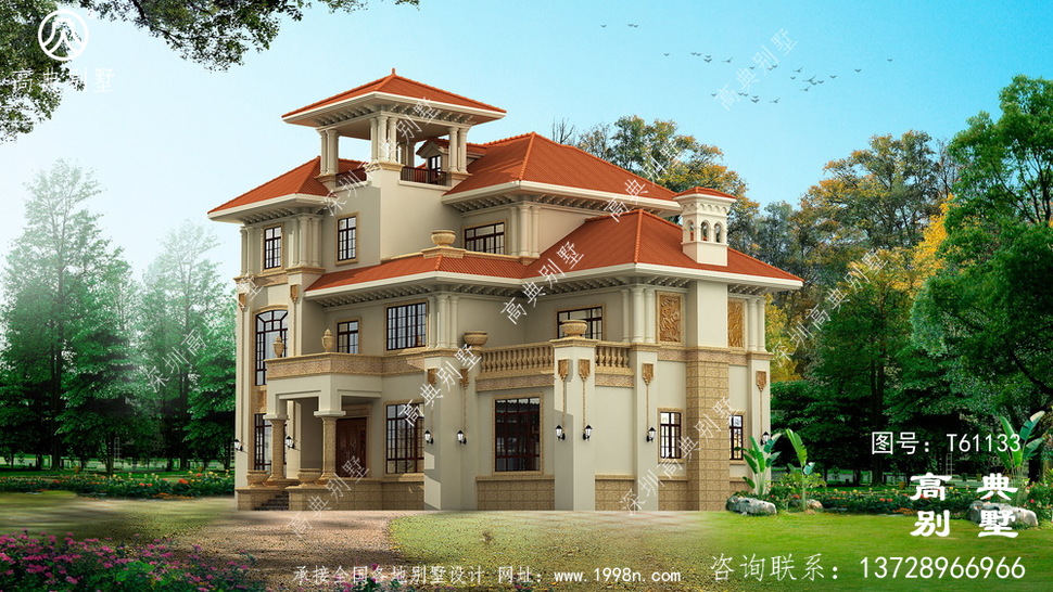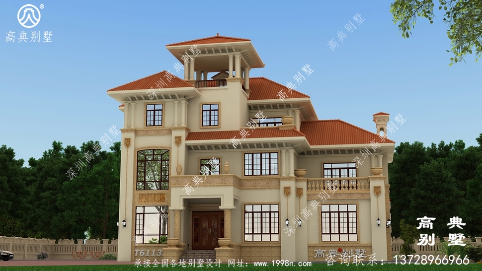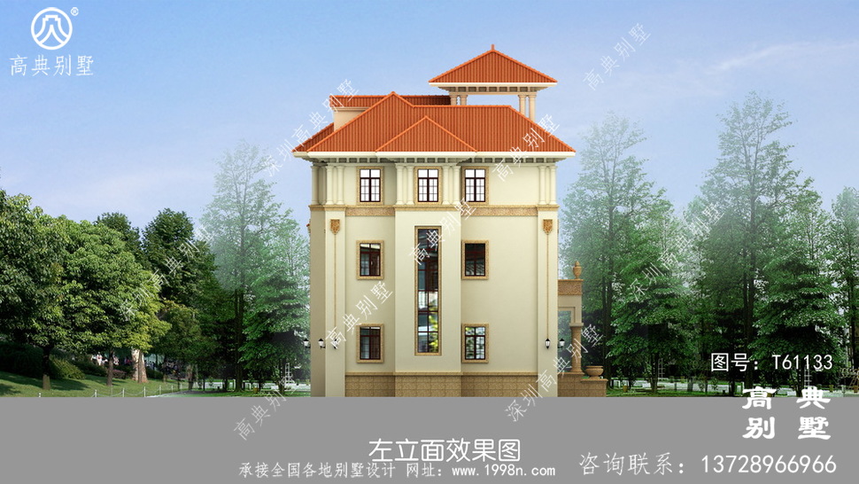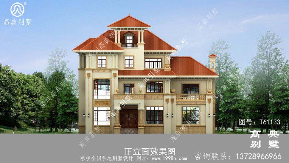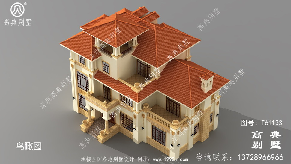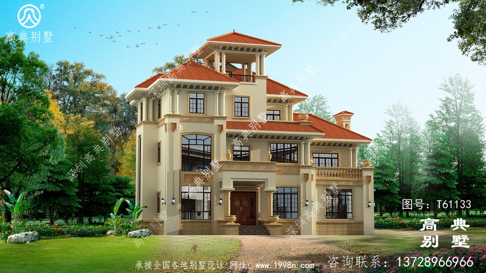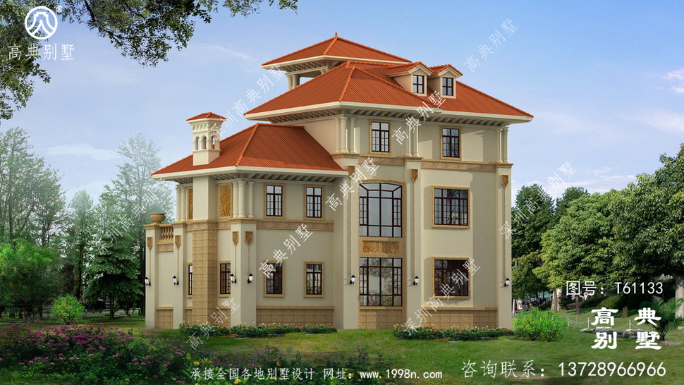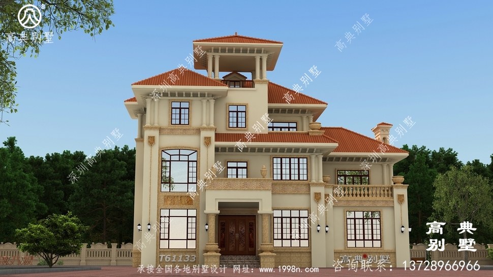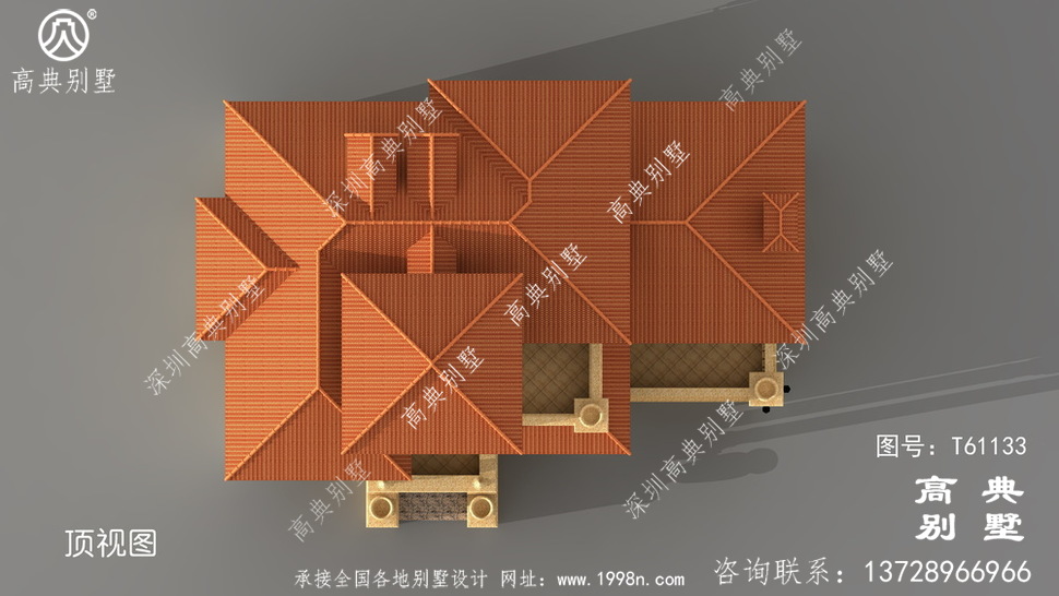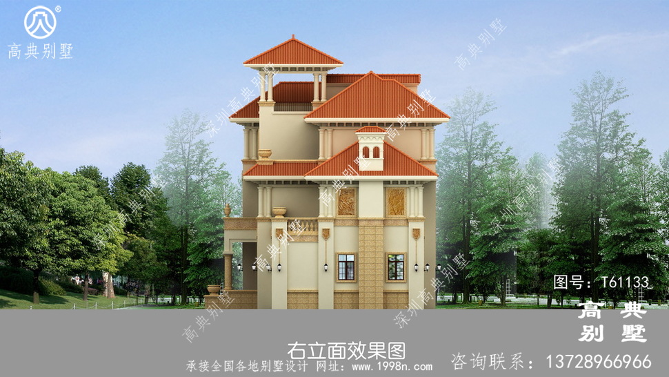 此别墅外墙主要材料:天然岩石漆、天然黄锈石板材、天然砂岩石浮雕、310X310 S瓦、GRC水泥构件