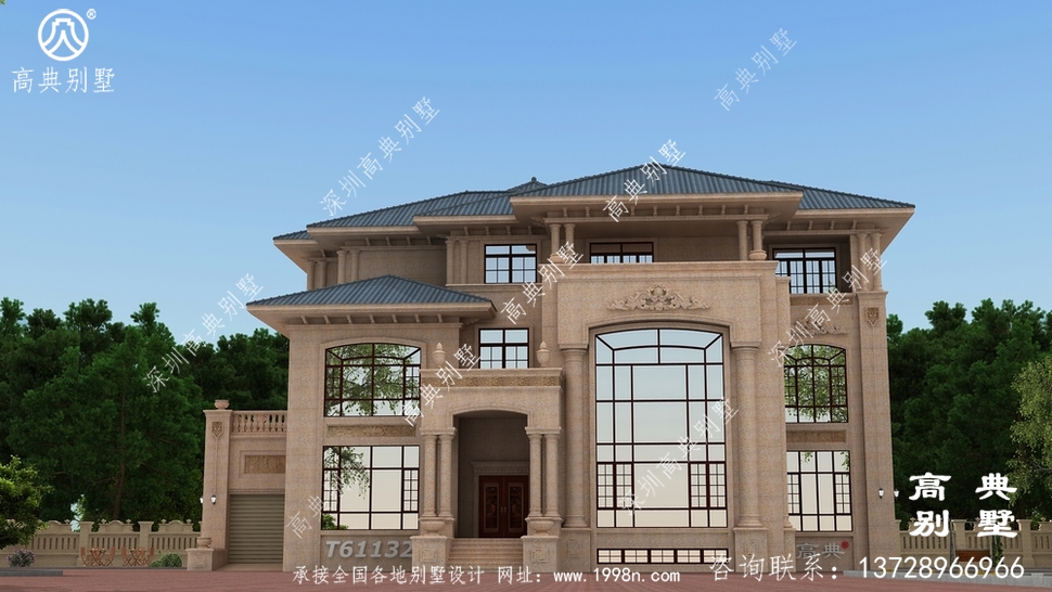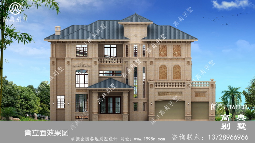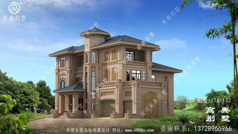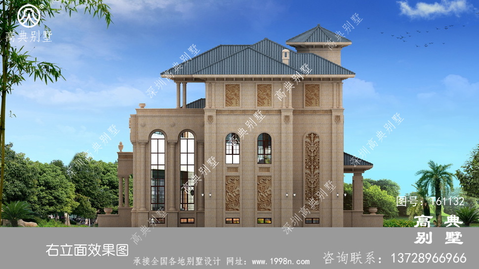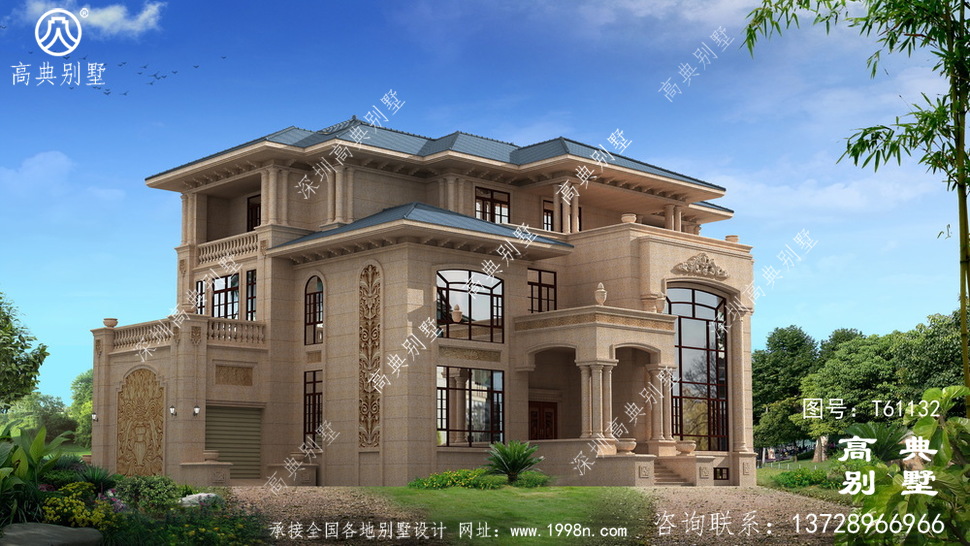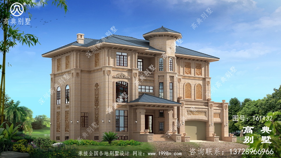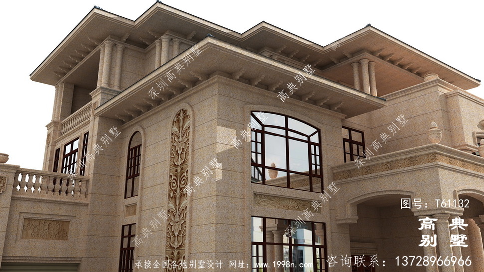 本别墅外墙全部采用沙漠棕石材干挂及天然砂岩石浮雕图案、外墙纯石材别墅、屋面用310X310 S瓦