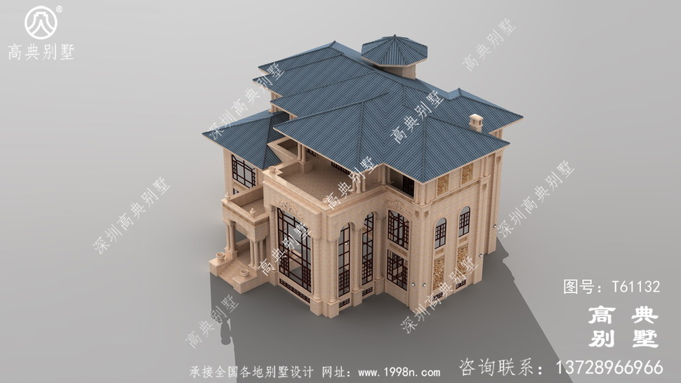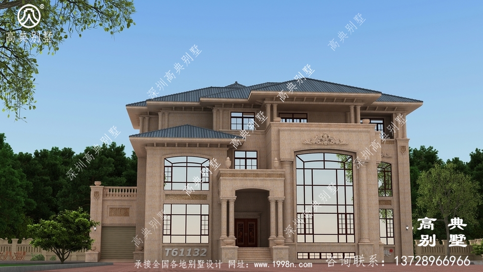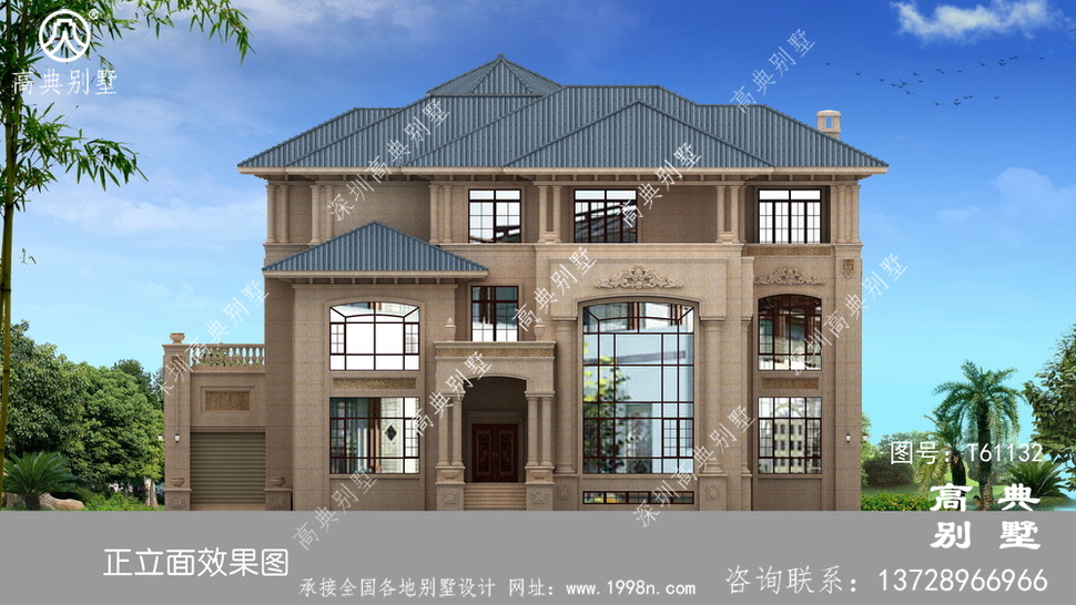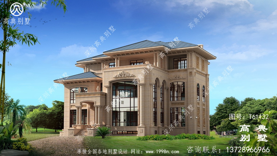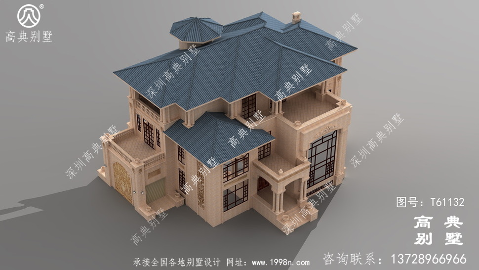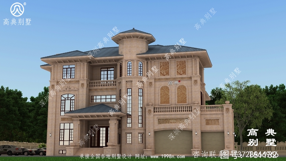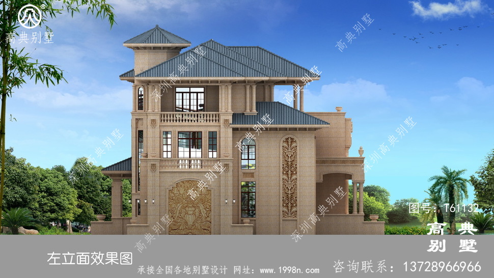 本别墅外墙全部采用沙漠棕石材干挂及天然砂岩石浮雕图案、外墙纯石材别墅、屋面用310X310 S瓦