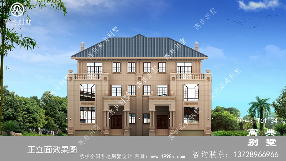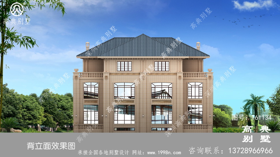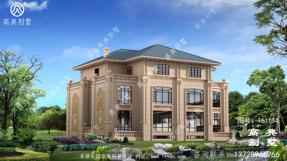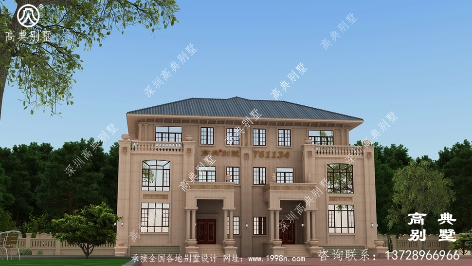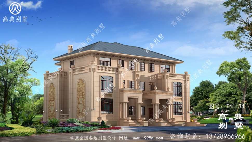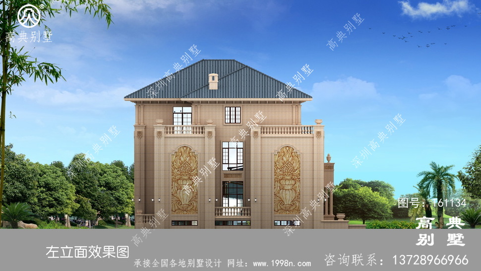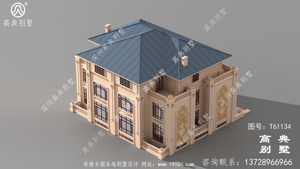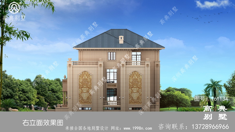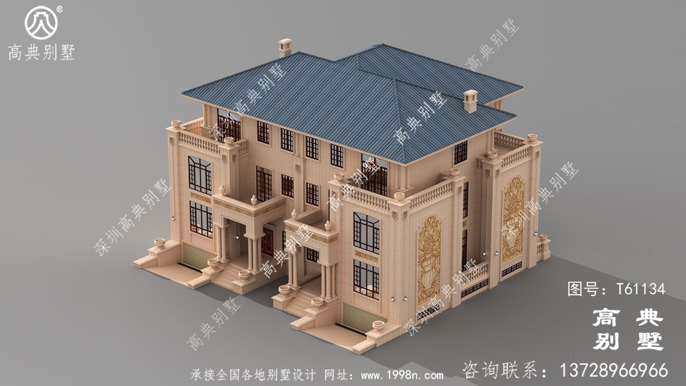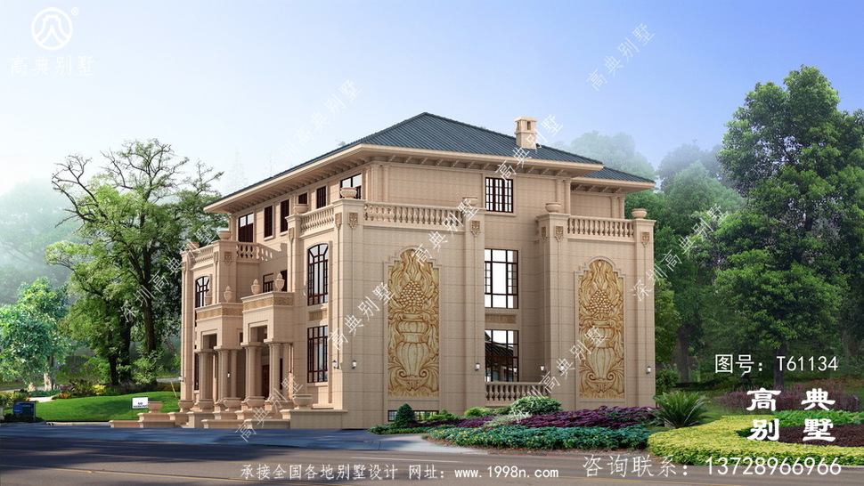 本别墅外墙全部采用沙漠棕石材干挂及天然砂岩石浮雕图案、外墙纯石材别墅、屋面用310X310 S瓦