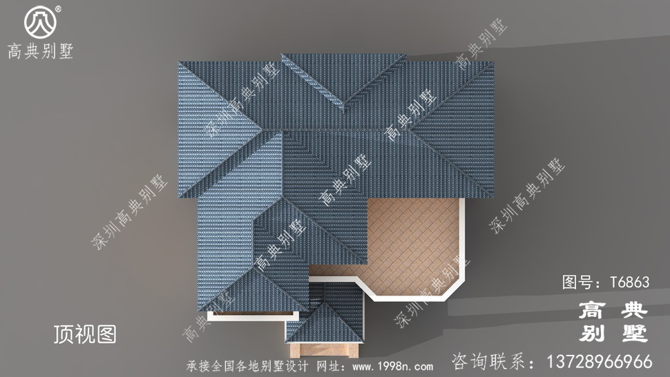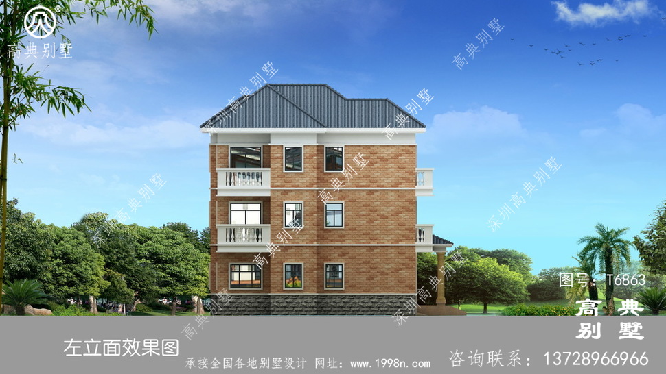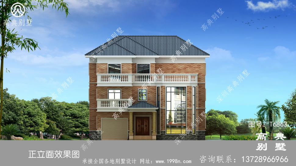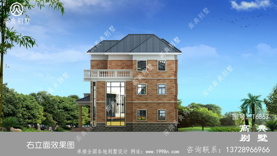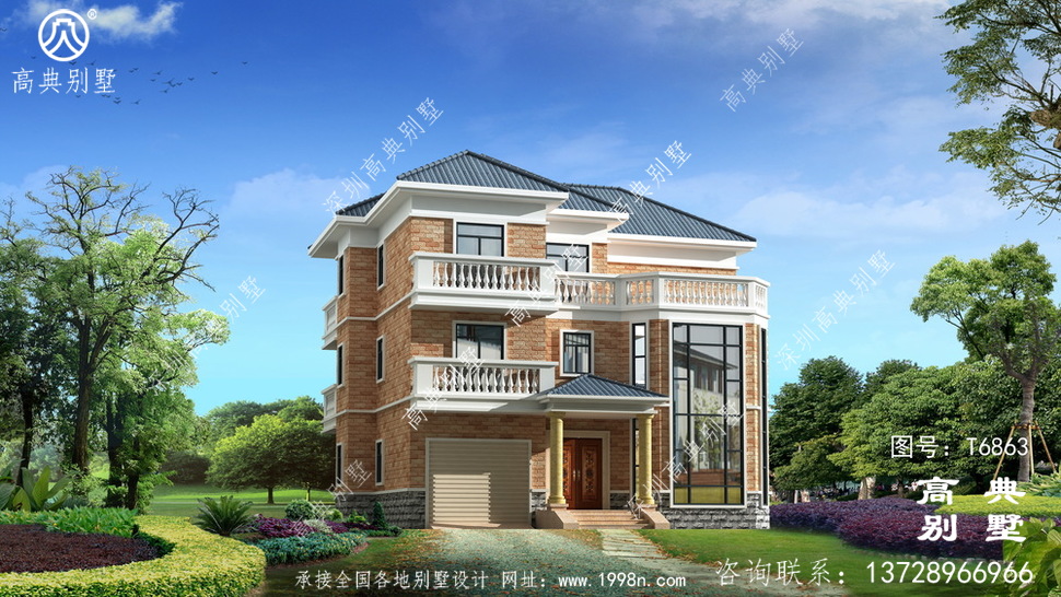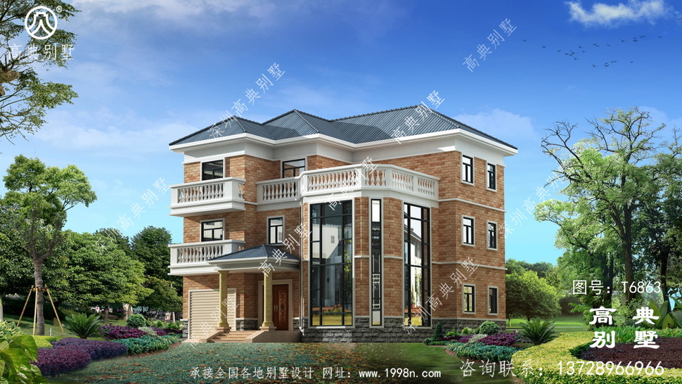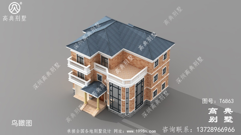 此别墅外墙主要材料:外墙贴蘑菇面黄锈石、西瓦、GRC水泥葫芦柱、墙裙蘑菇面麻石、白色真石漆