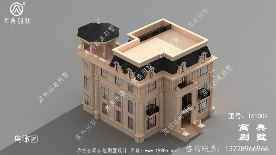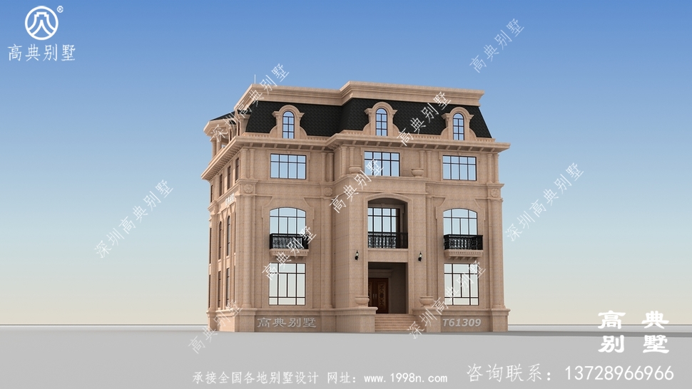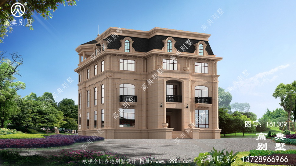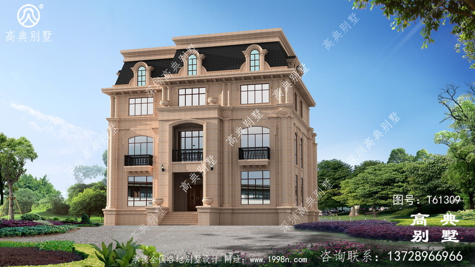 本别墅外墙全部采用福建瑕红石材干挂、外墙纯石材别墅、屋面用黑色瓦