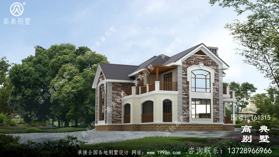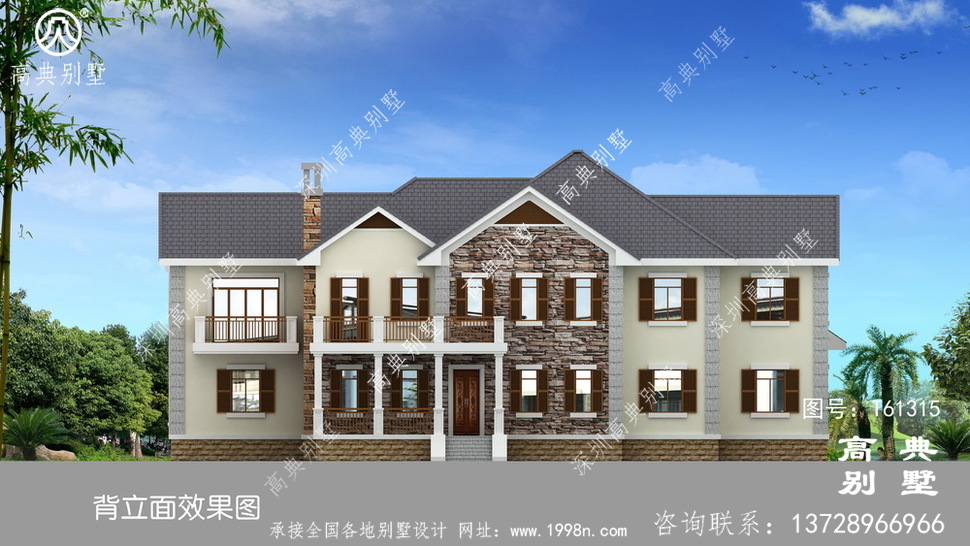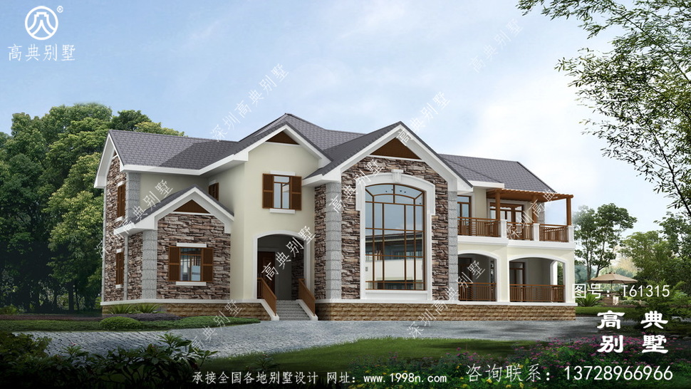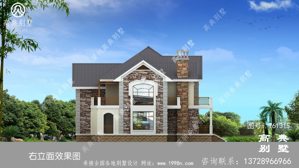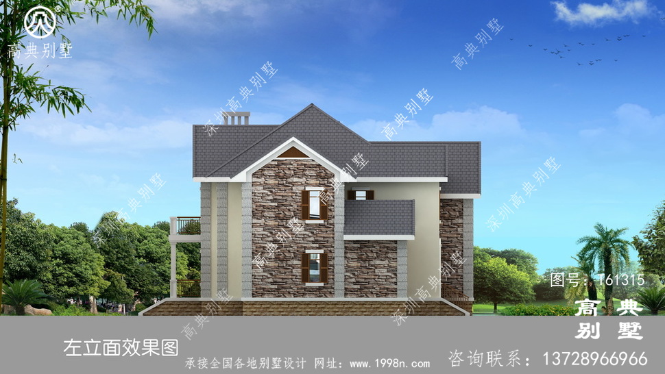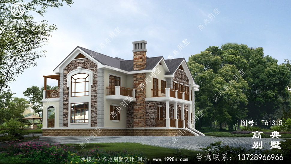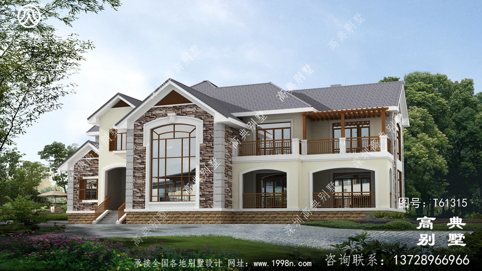 此别墅外墙主要材料:天然岩石漆、包边装饰火烧面白麻石板材、屋面水泥平板瓦