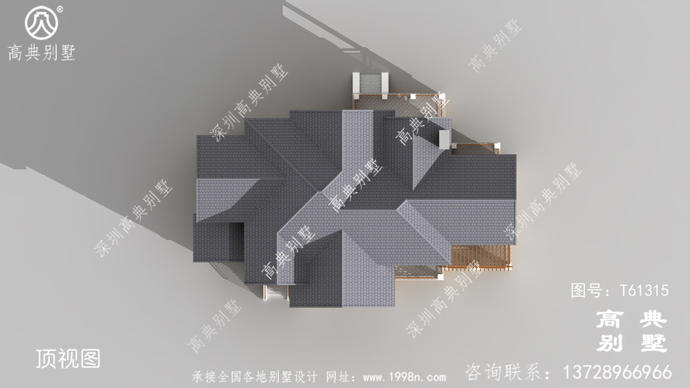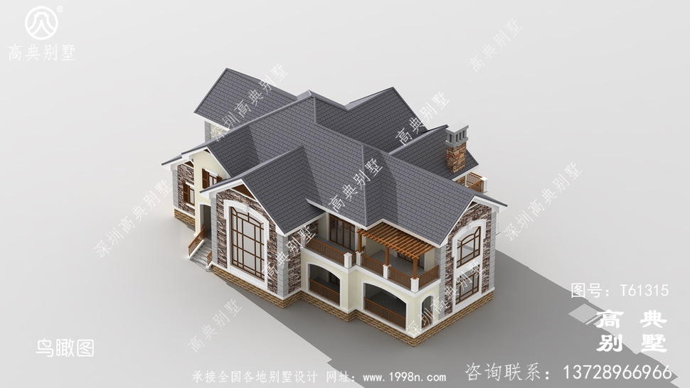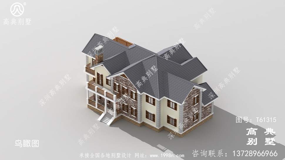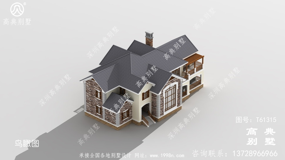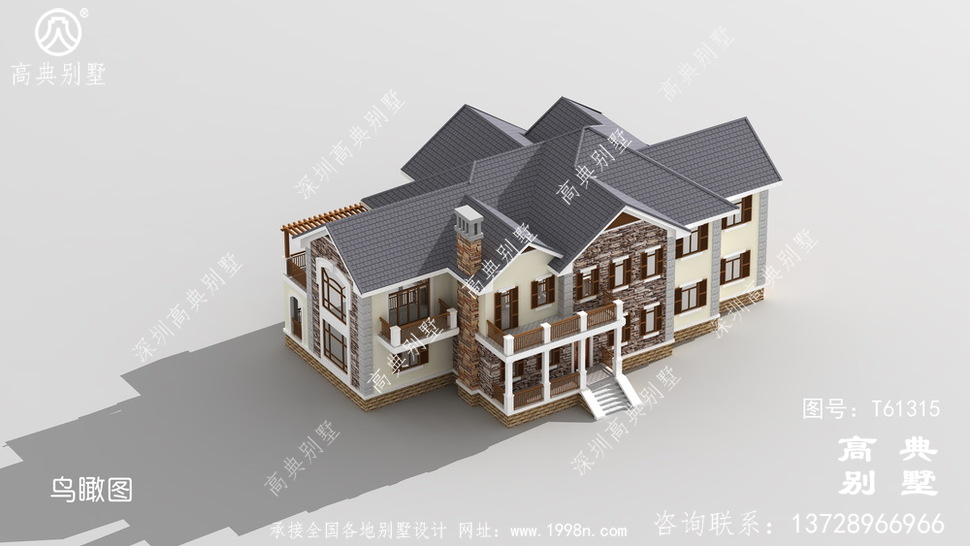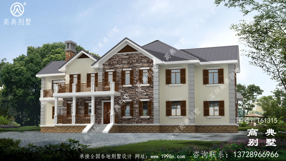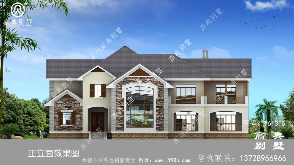 此别墅外墙主要材料:天然岩石漆、包边装饰火烧面白麻石板材、屋面水泥平板瓦