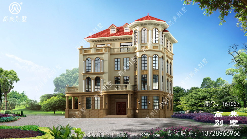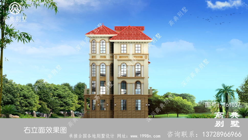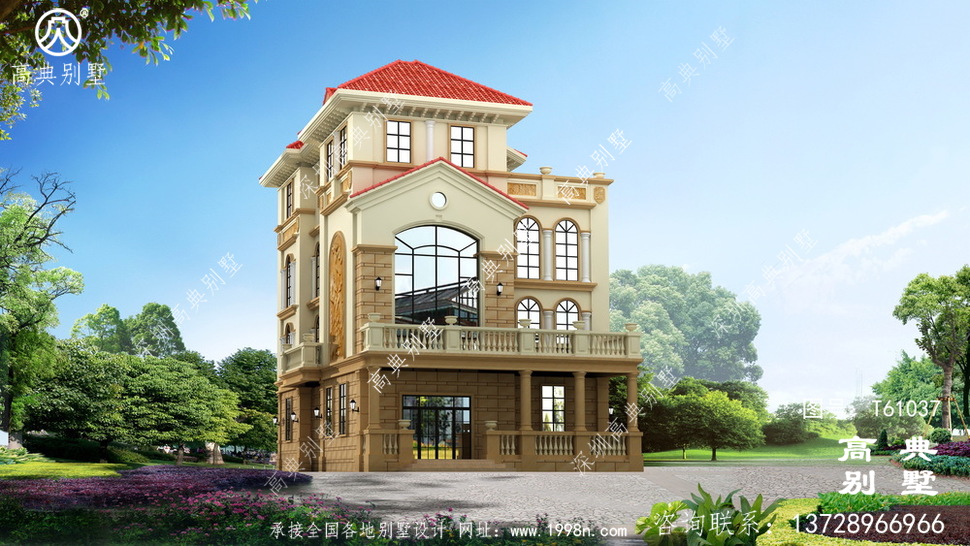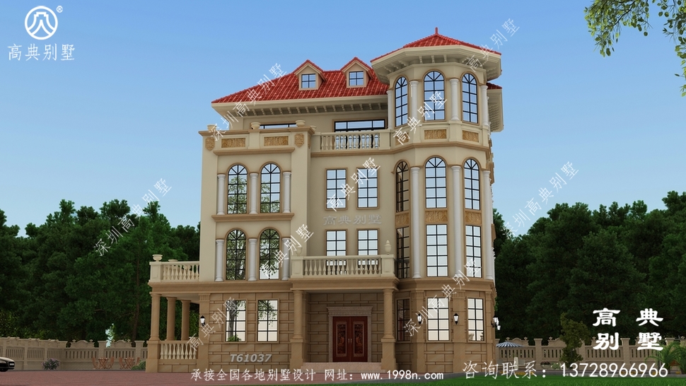 此别墅外墙主要材料:首层外墙贴砂岩石、二三四层外墙天然岩石漆、砂岩石浮雕、屋面西瓦、GRC构件