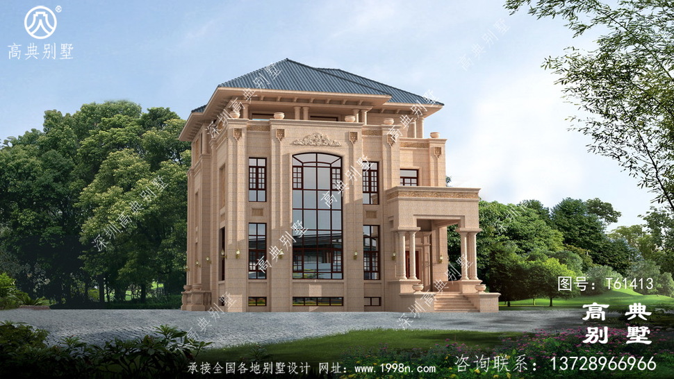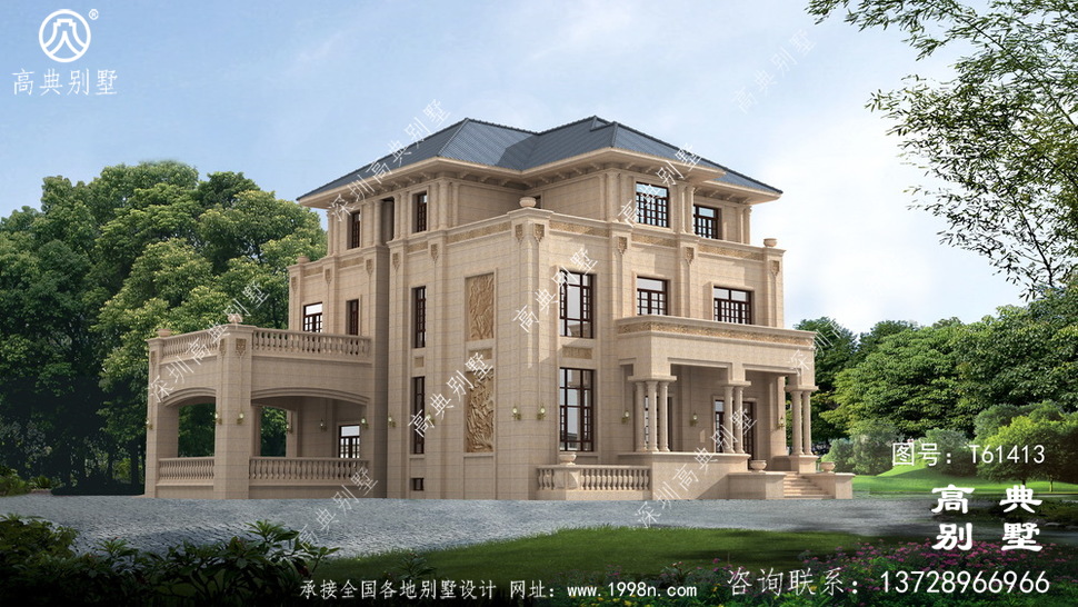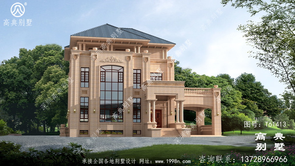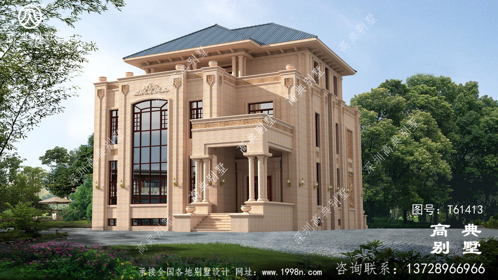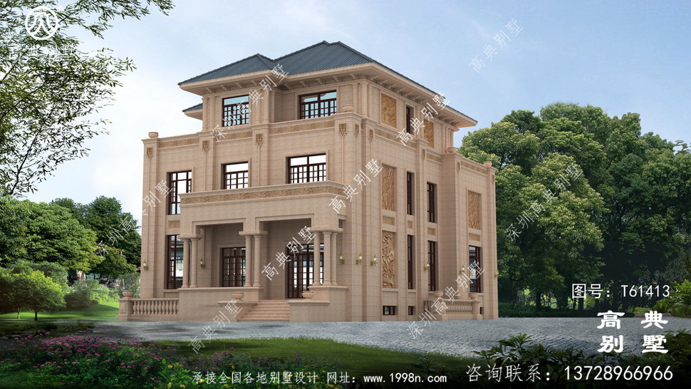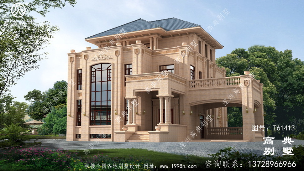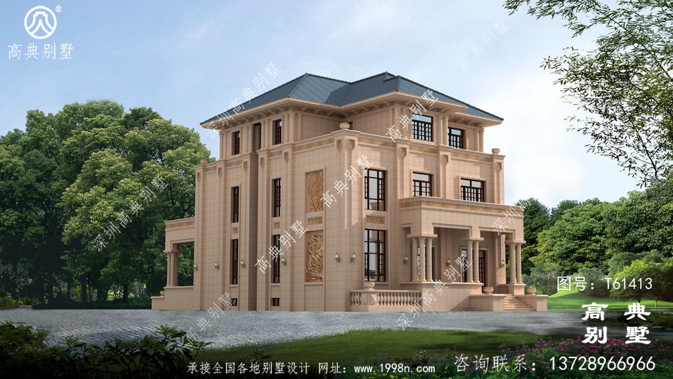 本别墅外墙全部采用荔枝面沙漠棕石材干挂、外墙纯石材别墅、屋面用310X310S瓦