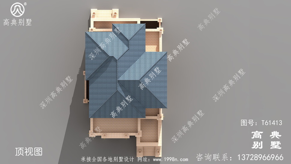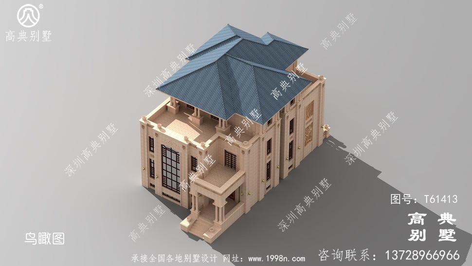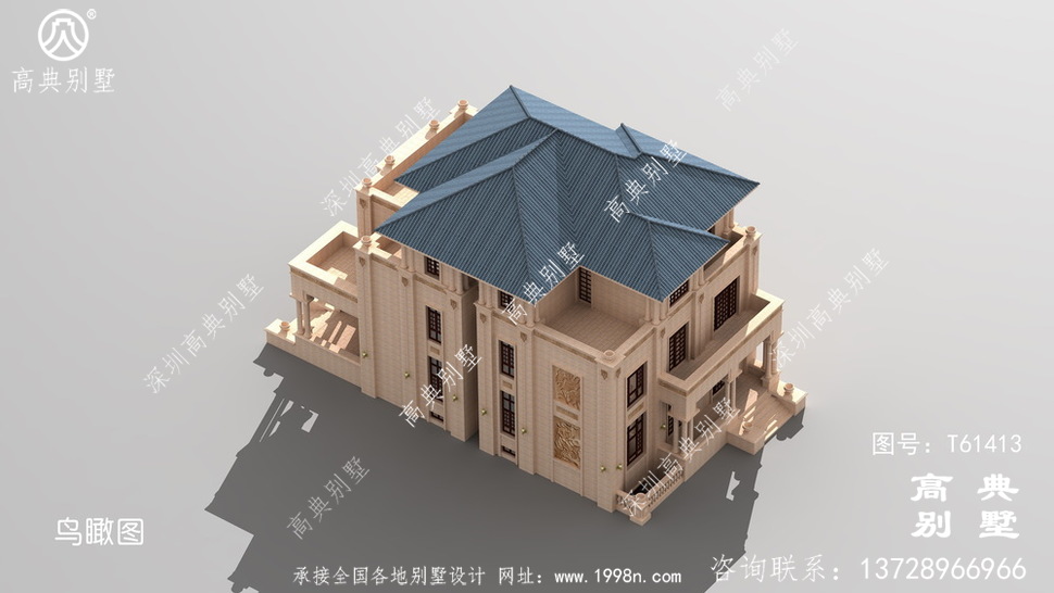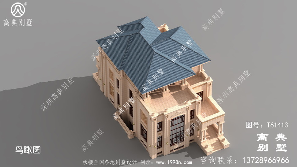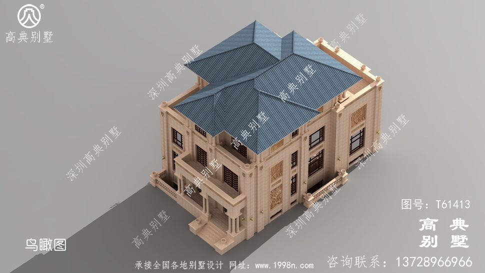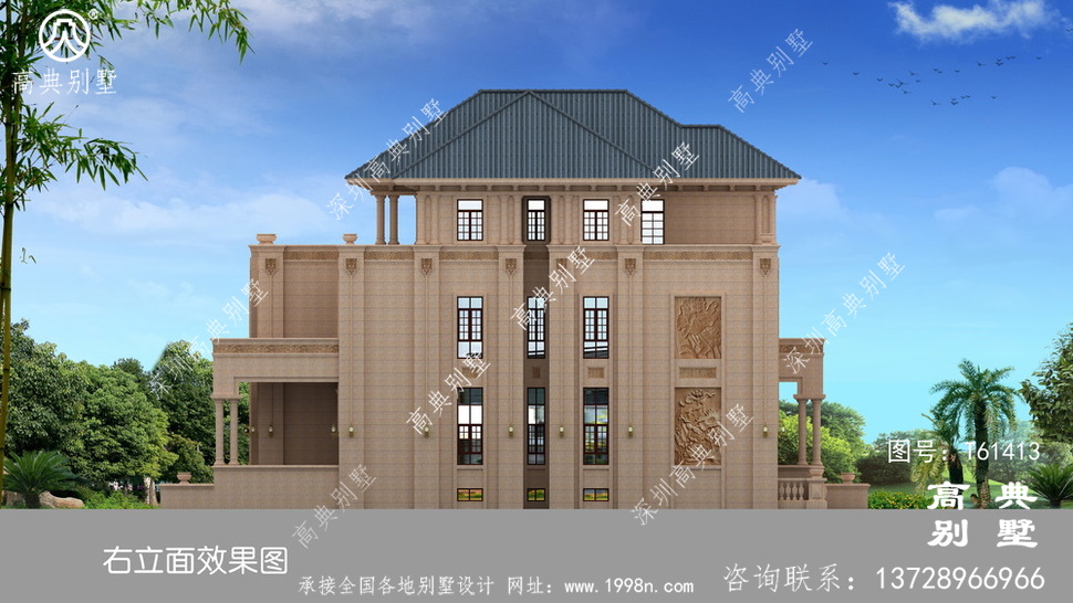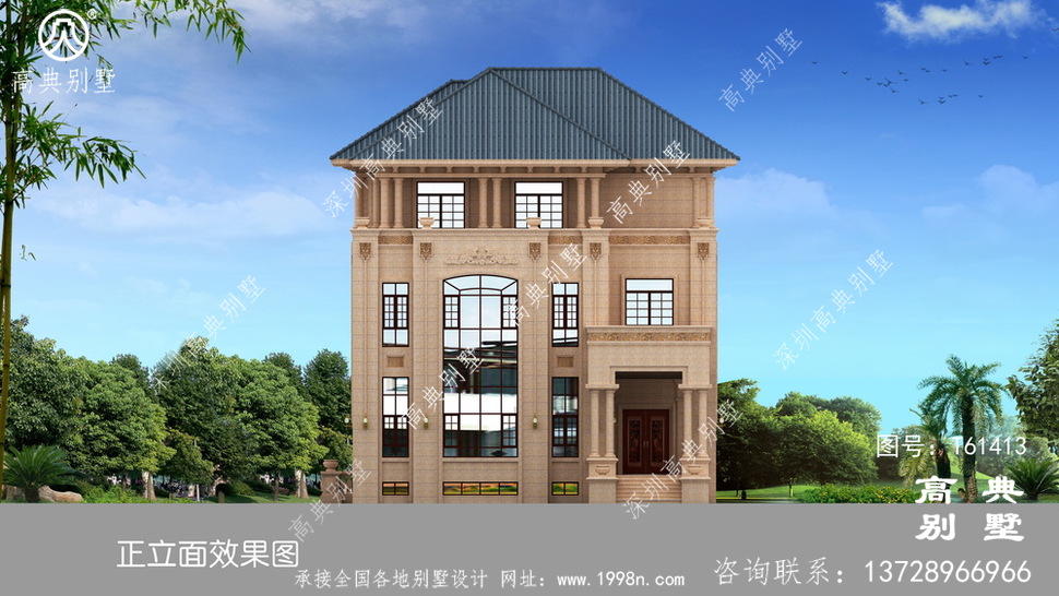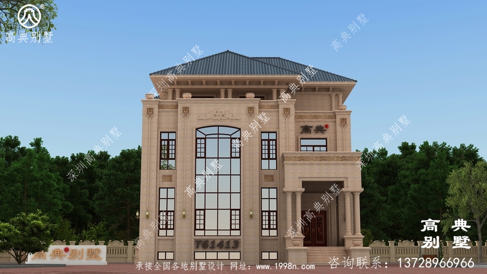 本别墅外墙全部采用荔枝面沙漠棕石材干挂、外墙纯石材别墅、屋面用310X310S瓦