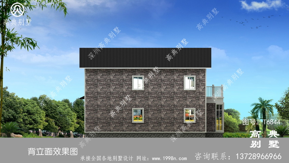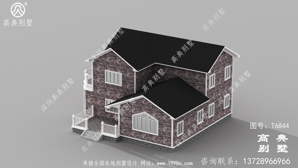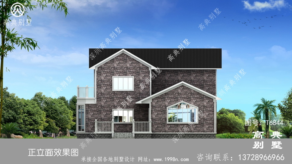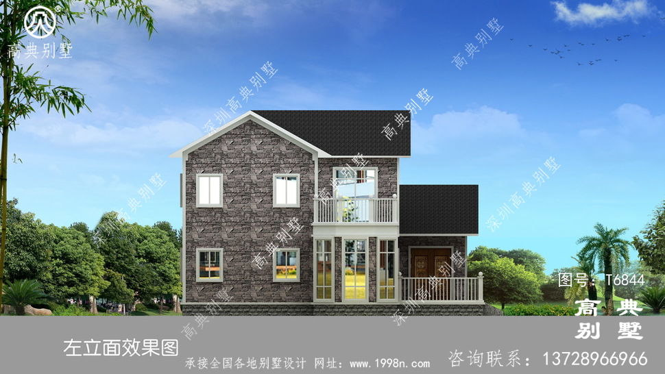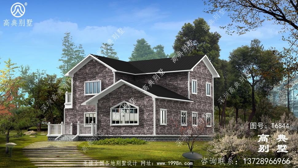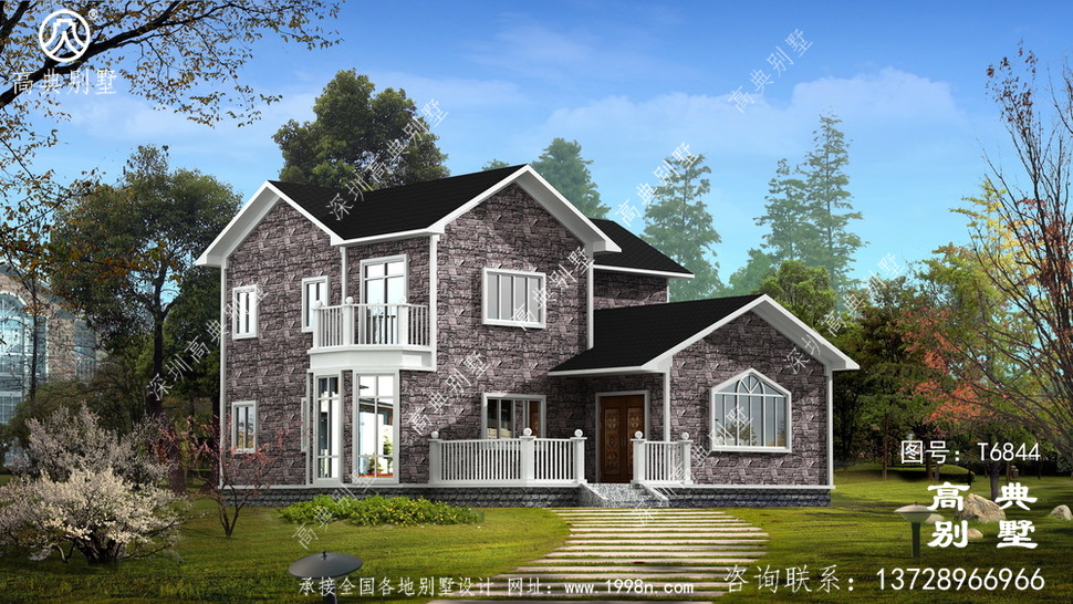 此别墅外墙主要材料:外墙涂料、屋面玻纤瓦、木栏杆、外墙文化石