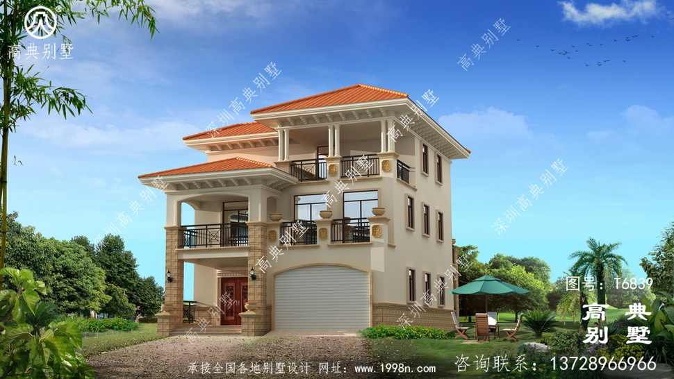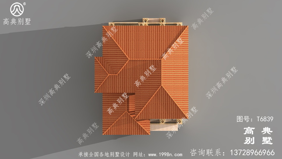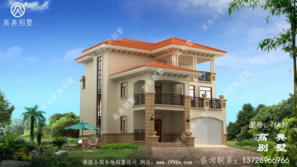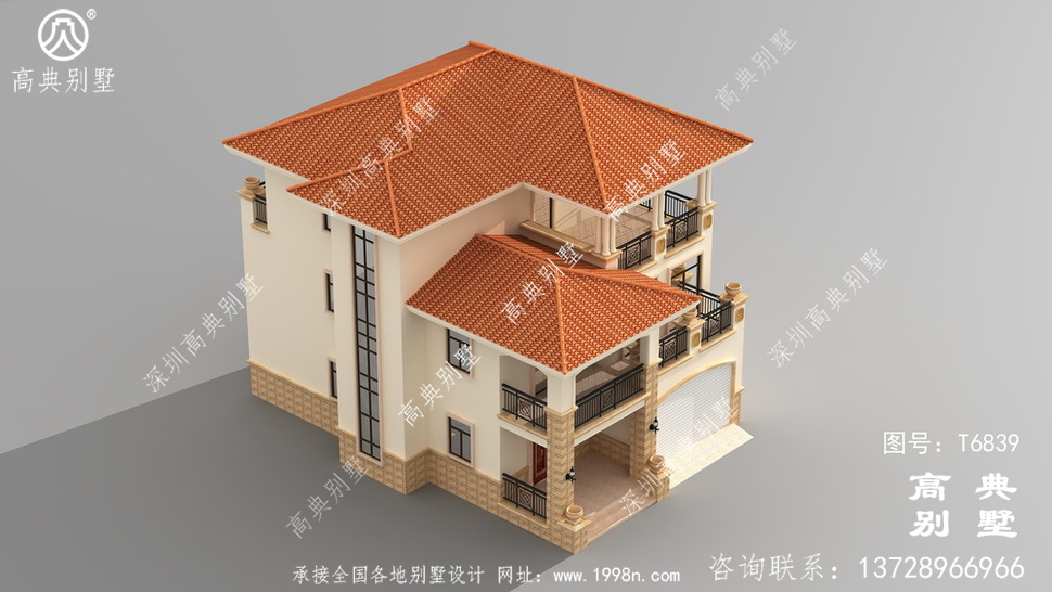 此别墅外墙主要材料:天然岩石漆、天然砂岩石板材、天然砂岩石浮雕、310X310 S瓦、GRC水泥构件、铁艺栏杆