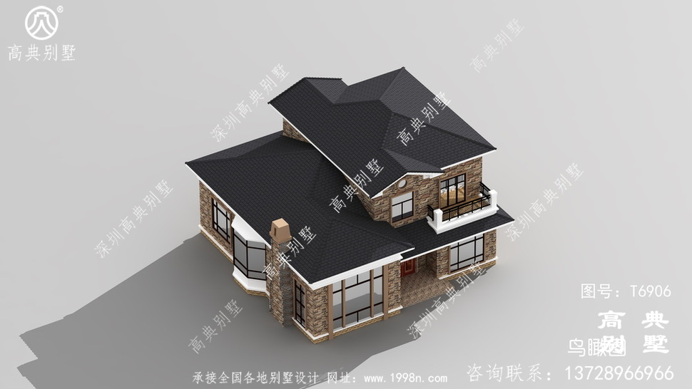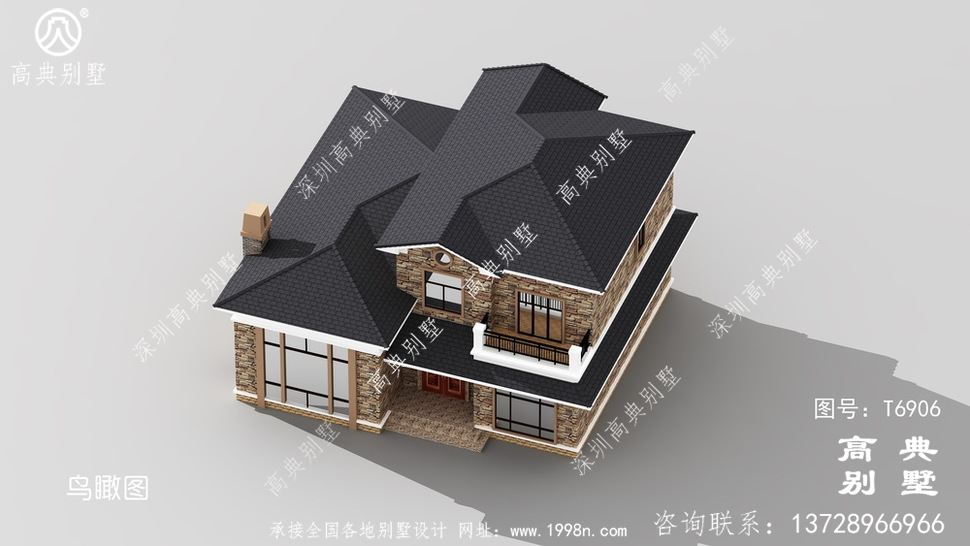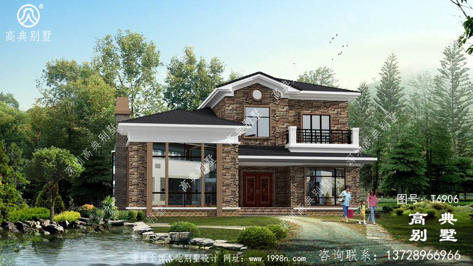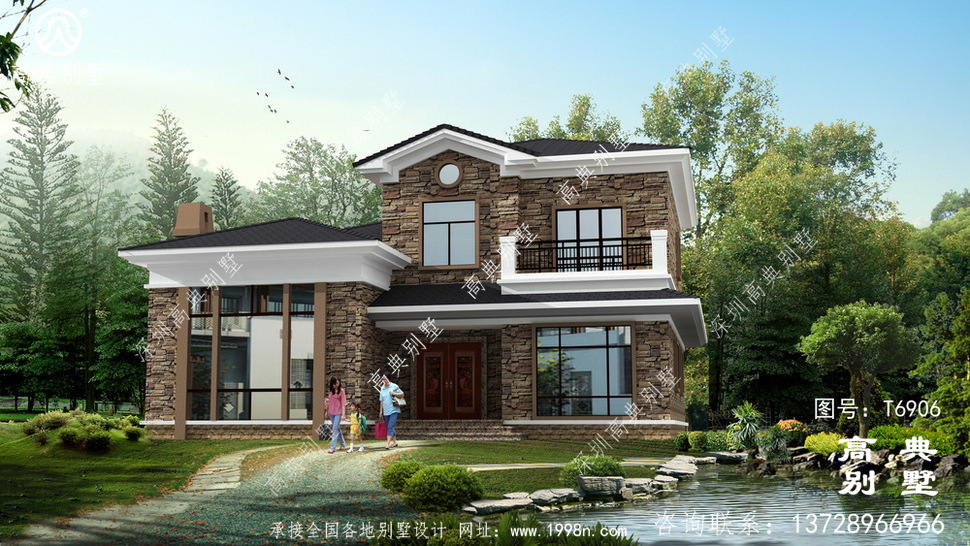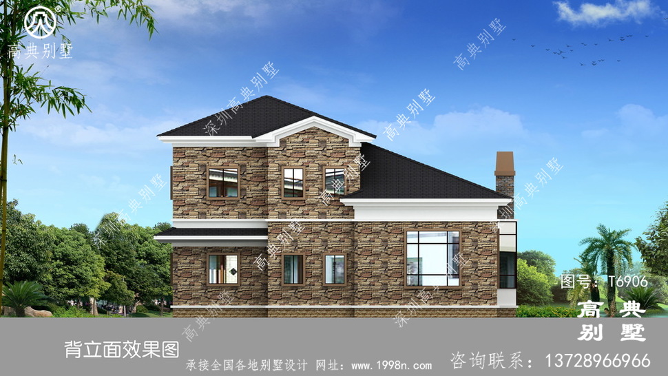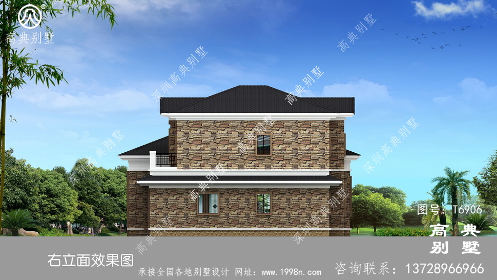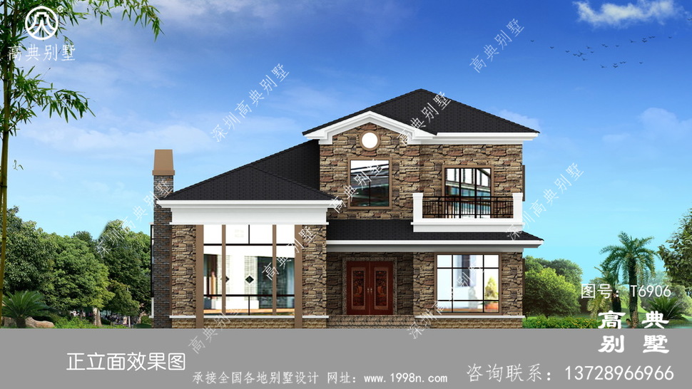 此别墅外墙主要材料:墙裙蘑菇面黄锈石、屋面水泥平板瓦(或玻纤瓦)、外墙真石漆、外墙文化石