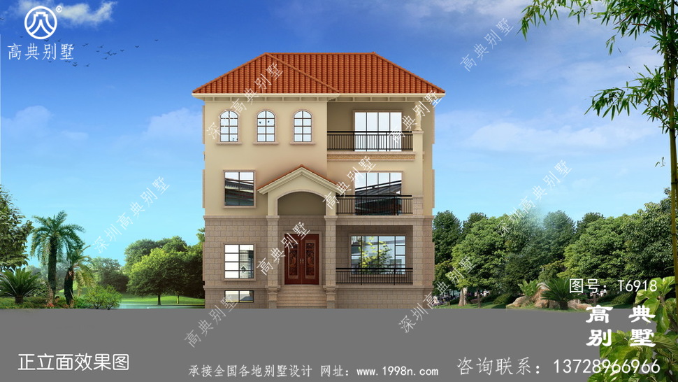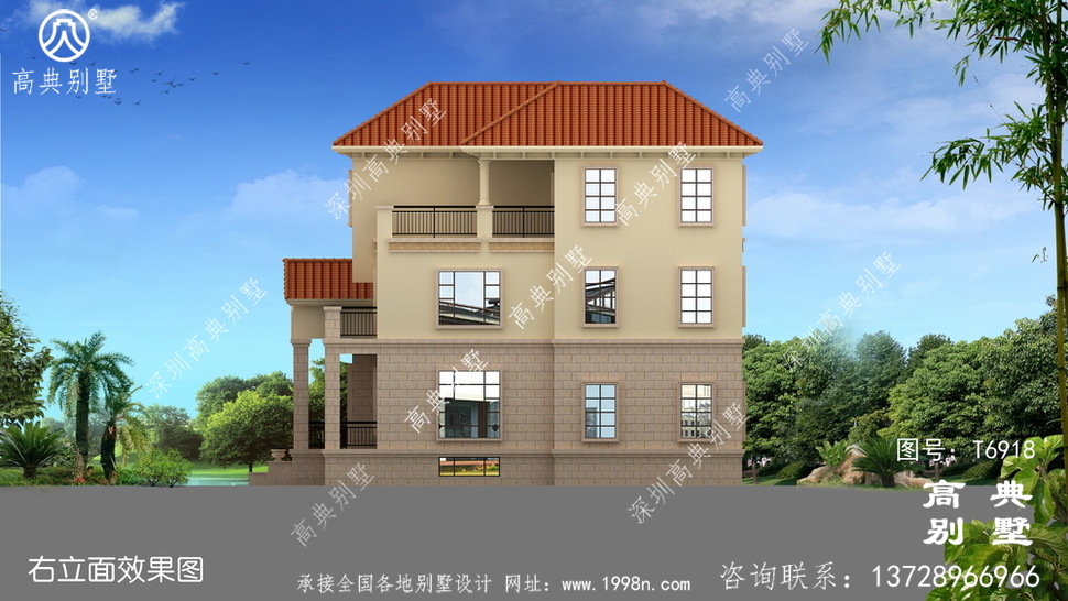 此别墅外墙主要材料:外墙涂料、西瓦、铁艺栏杆、仿石材外墙砖、天然砂岩石浮雕