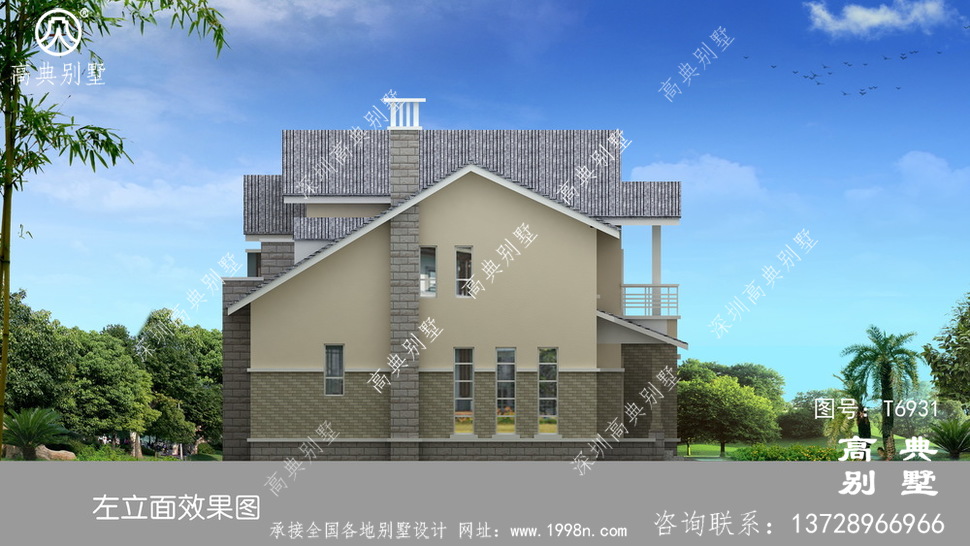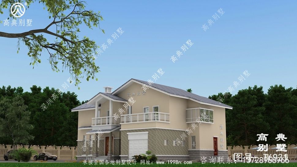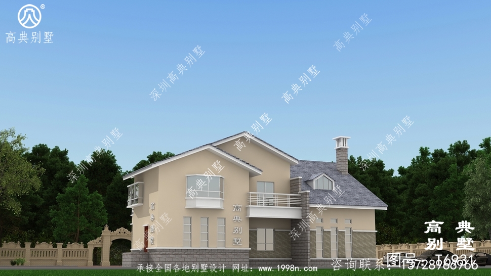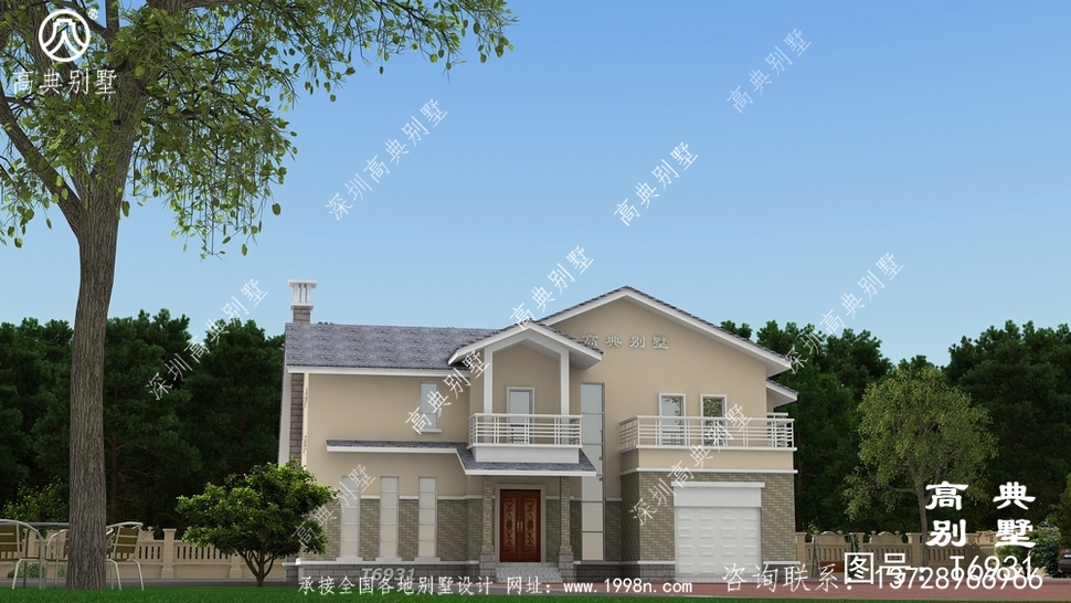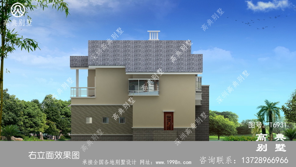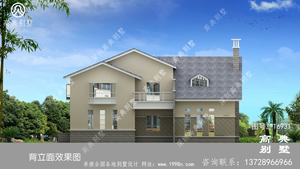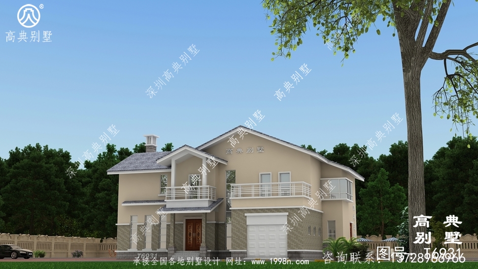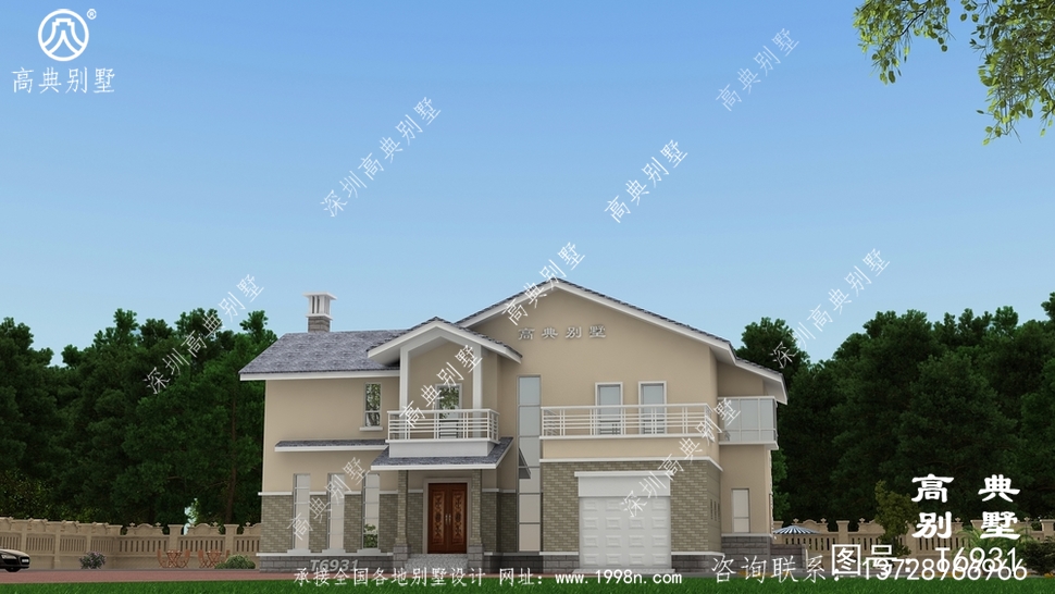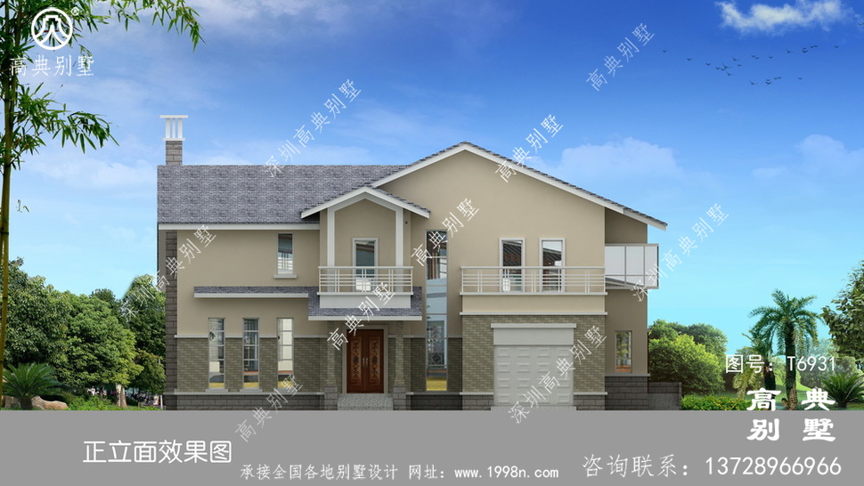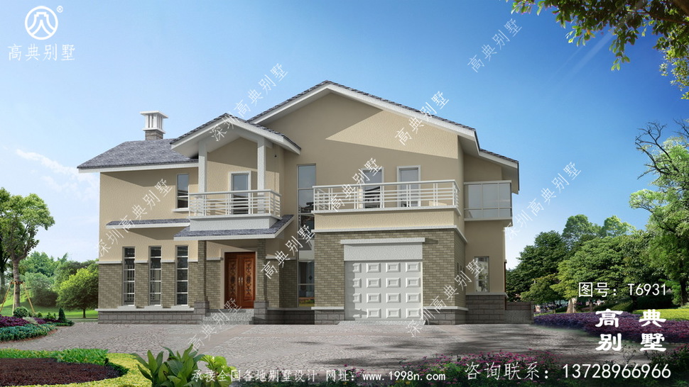 此栋别墅外墙主要建筑材料:天然岩石漆、外墙砖、水泥平板瓦、铁艺栏杆