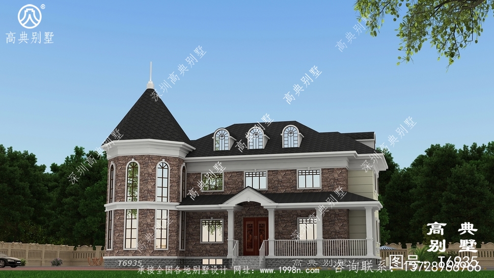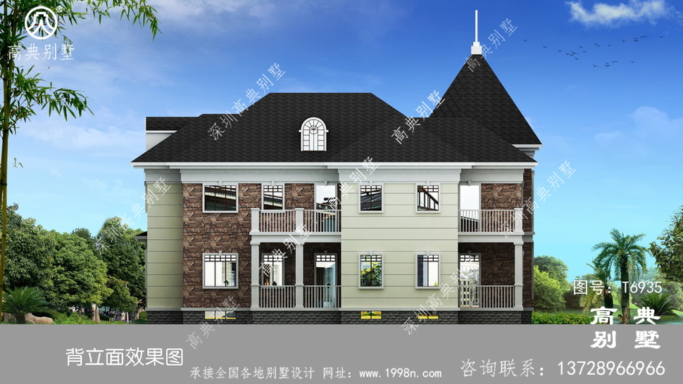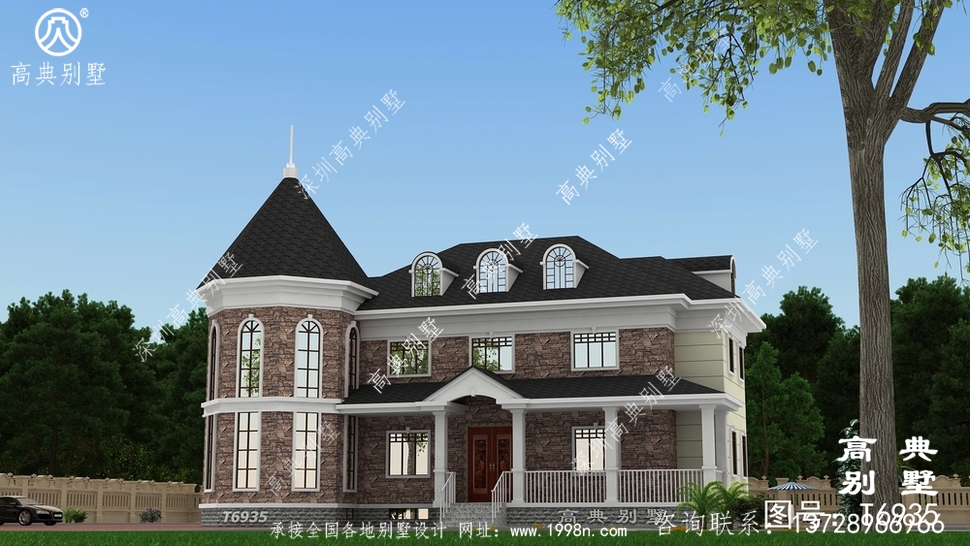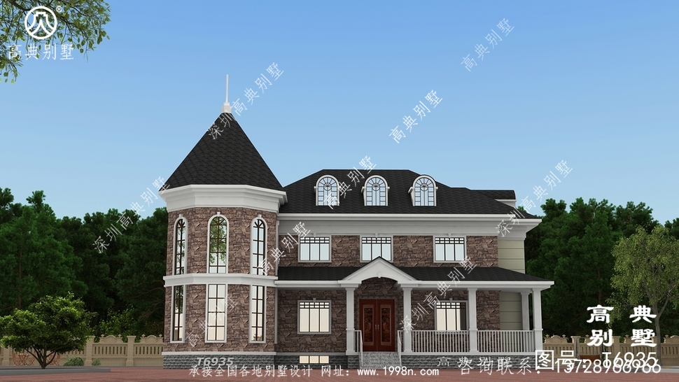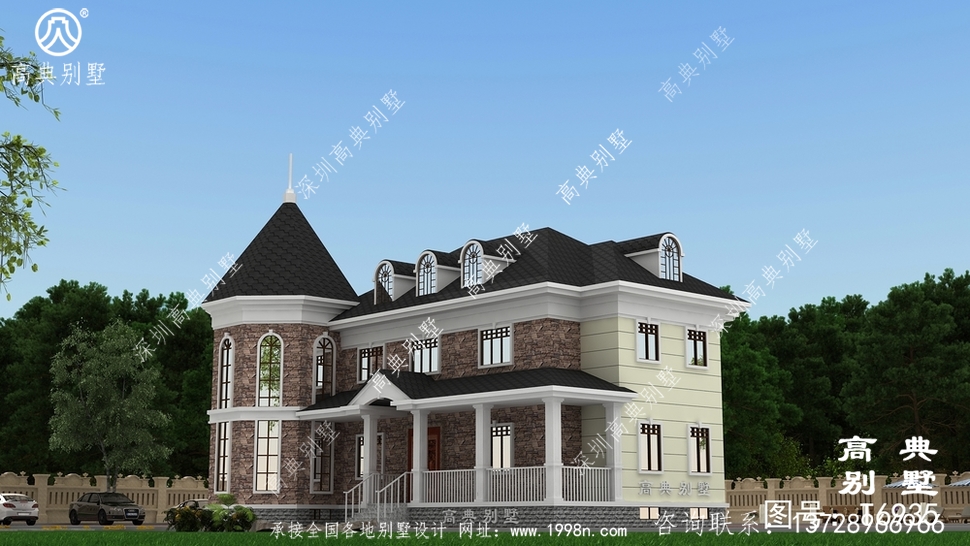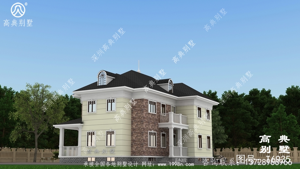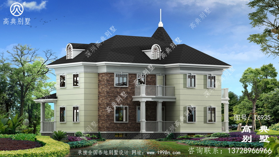 此别墅外墙主要材料:天然岩石漆、文化石、水泥瓦、GRC水泥构件、铁艺栏杆