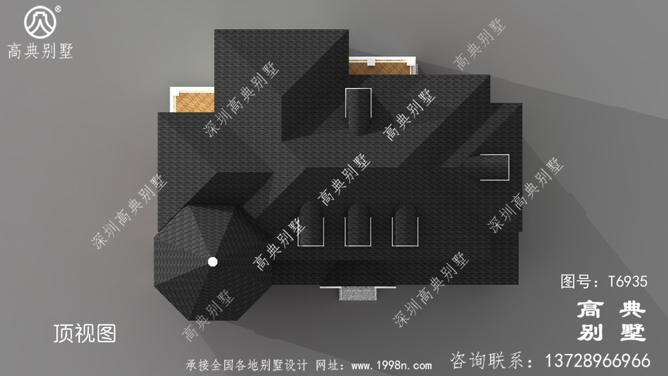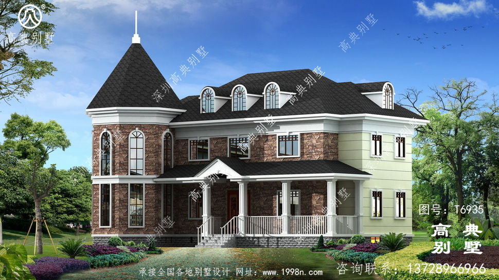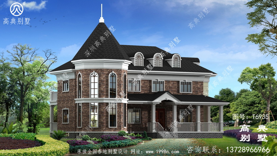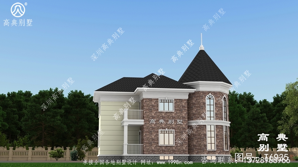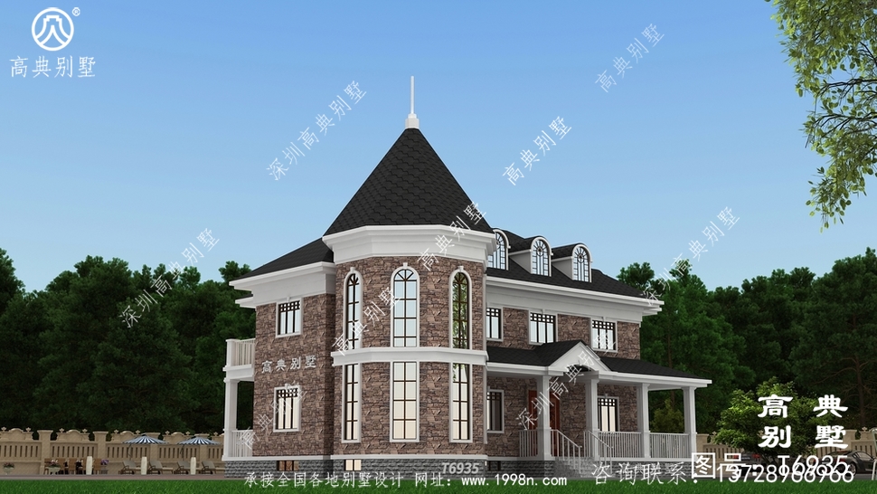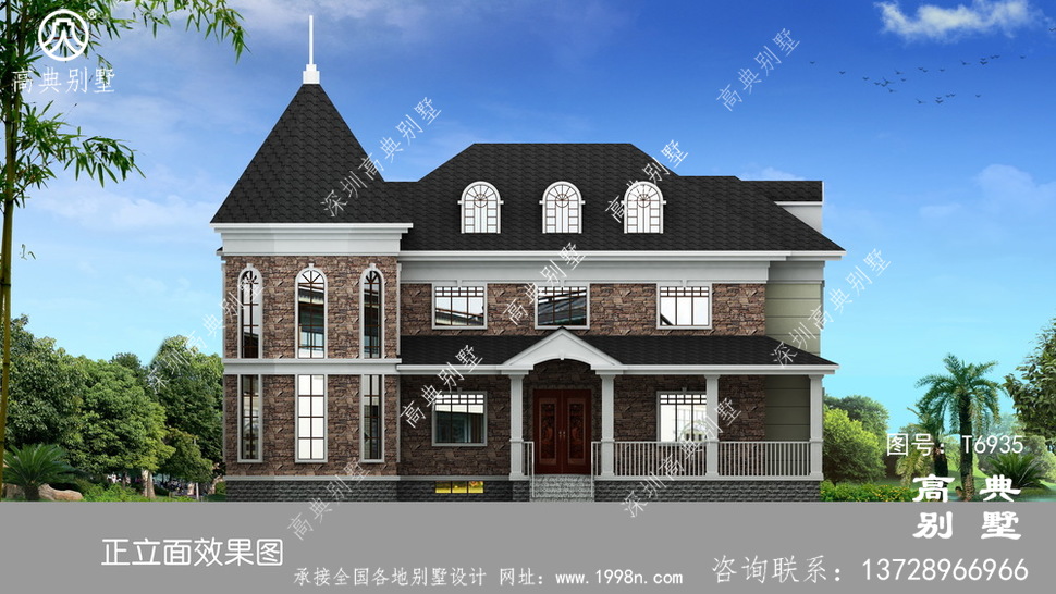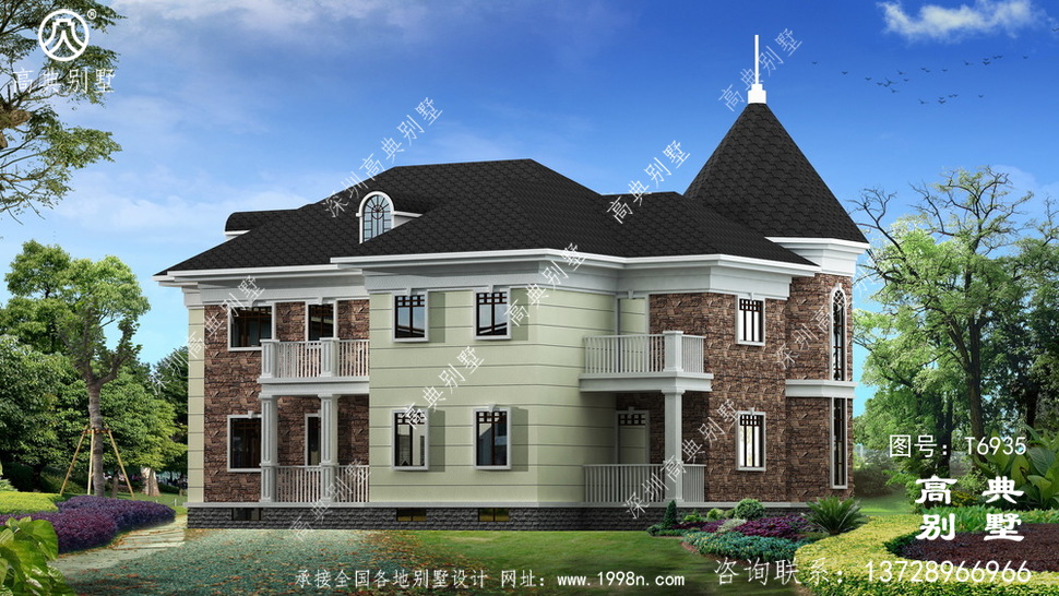 此别墅外墙主要材料:天然岩石漆、文化石、水泥瓦、GRC水泥构件、铁艺栏杆