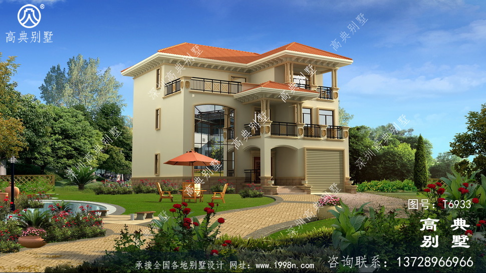 此别墅外墙主要材料:天然岩石漆、外墙文化石、310X310 S瓦、铁艺栏杆、蘑菇石