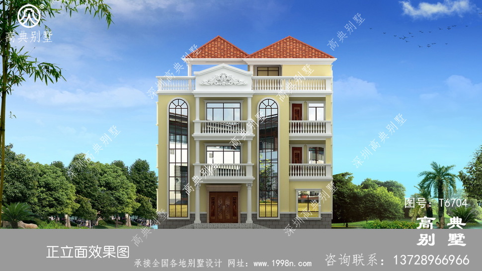 此别墅外墙主要材料:天然岩石漆、310X310 S瓦、GRC水泥构件
