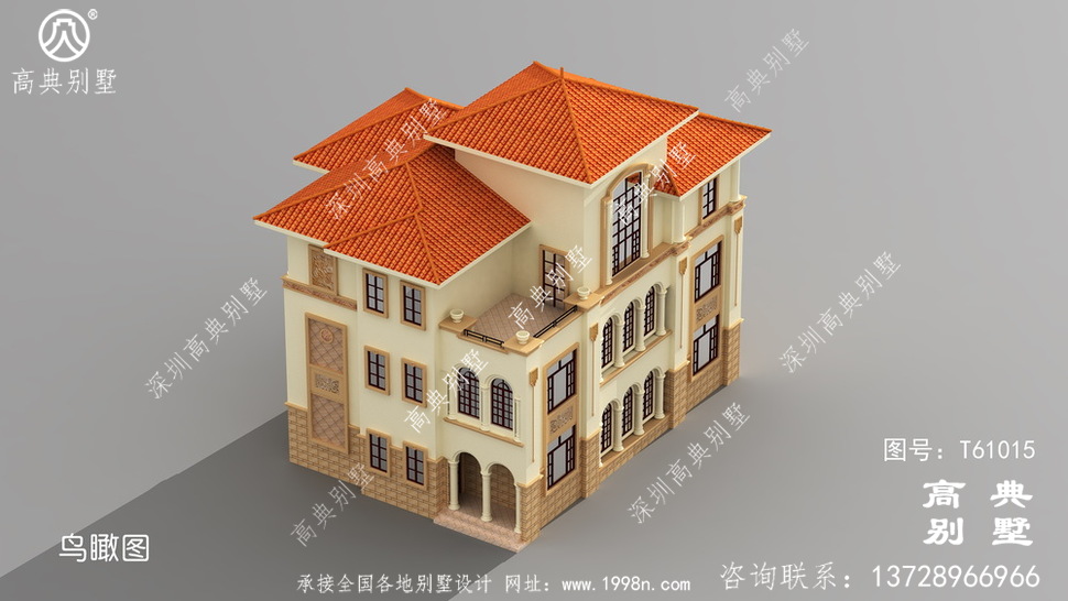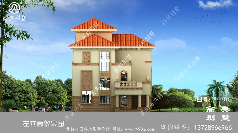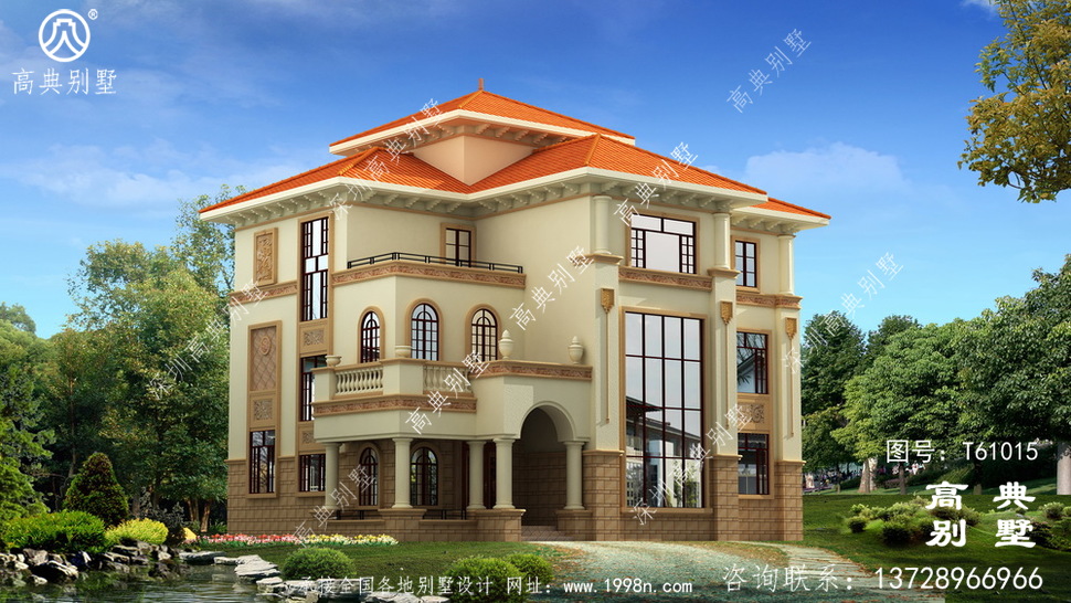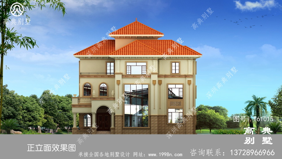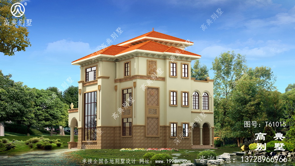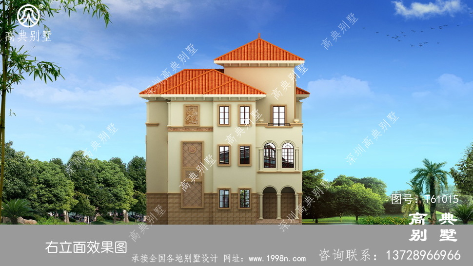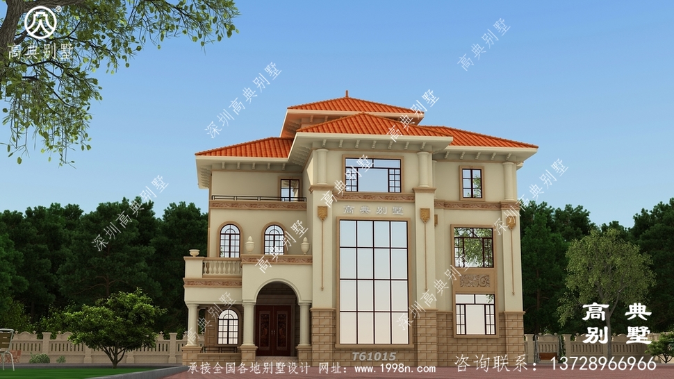 此栋别墅外墙主要建筑材料:天然岩石漆、天然砂岩石、天然砂岩石浮雕、310X310 S瓦、GRC水泥构件、铁艺栏杆