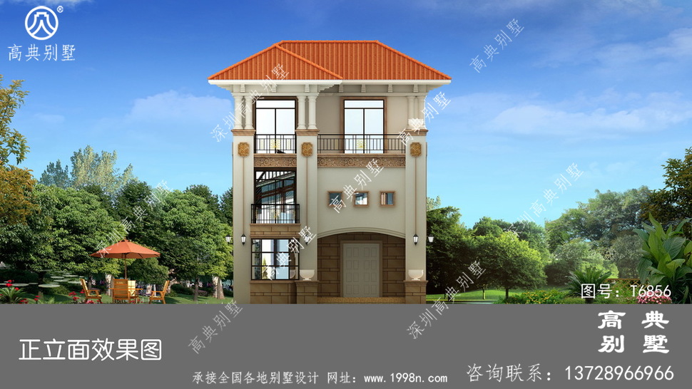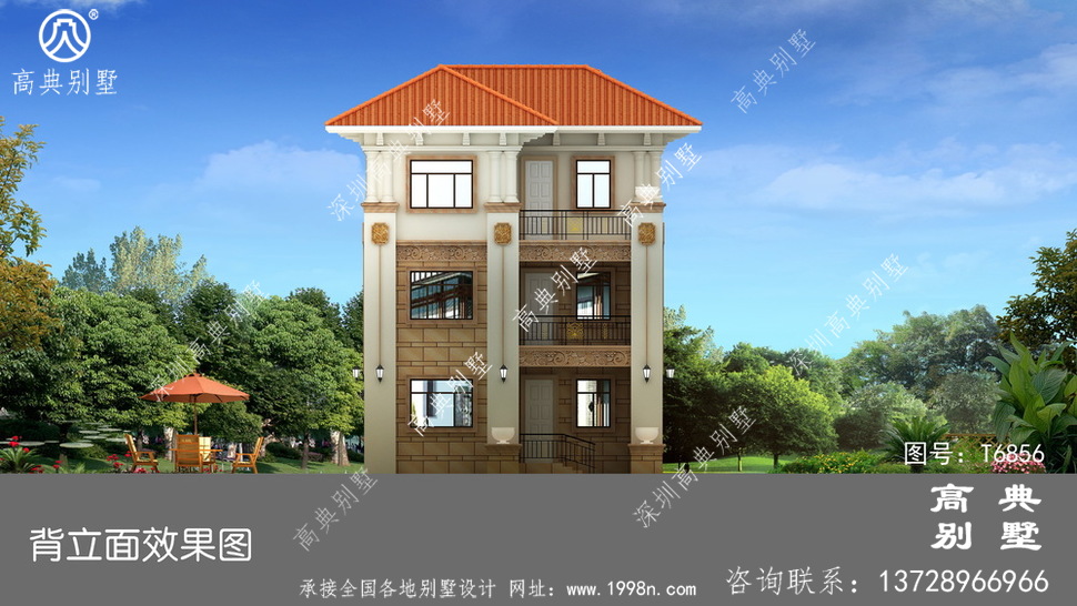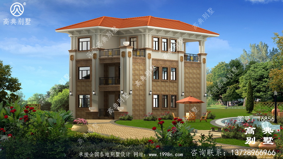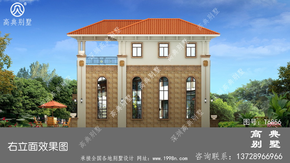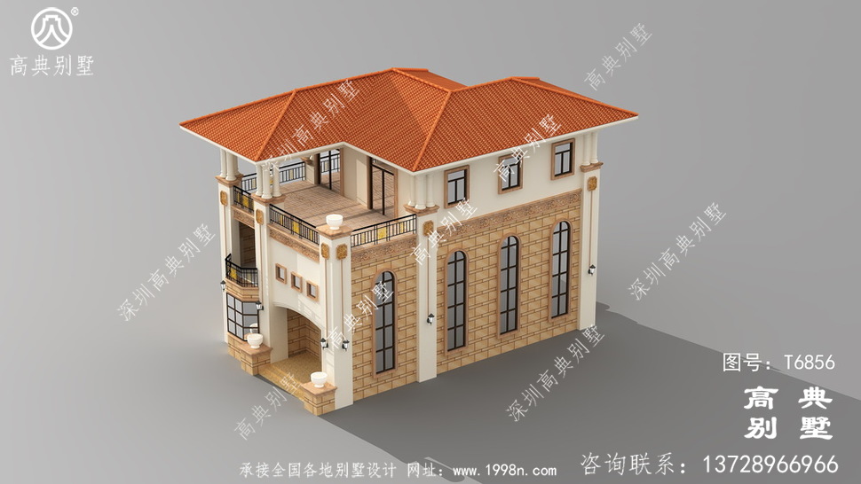 此别墅外墙主要材料:天然岩石漆、天然砂岩石板材、天然砂岩石浮雕、310X310 S瓦、GRC水泥构件、铁艺栏杆