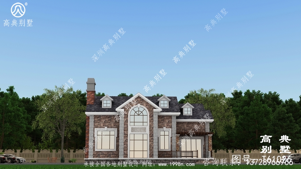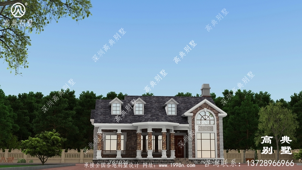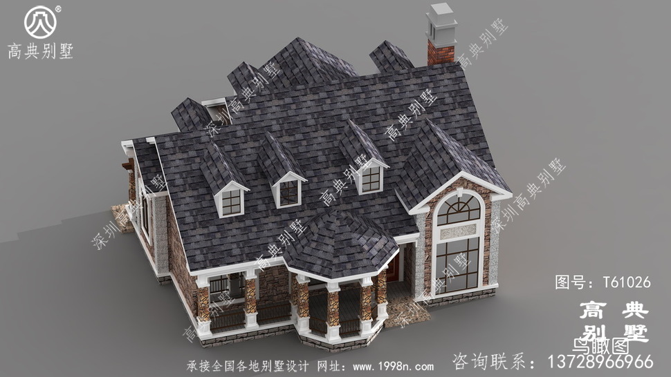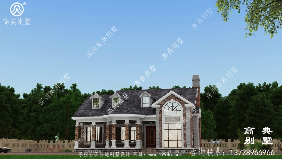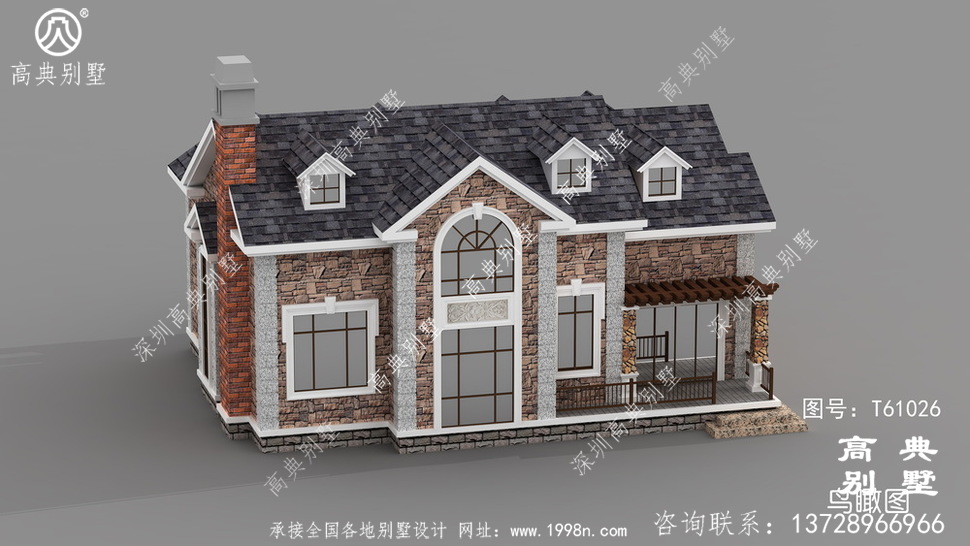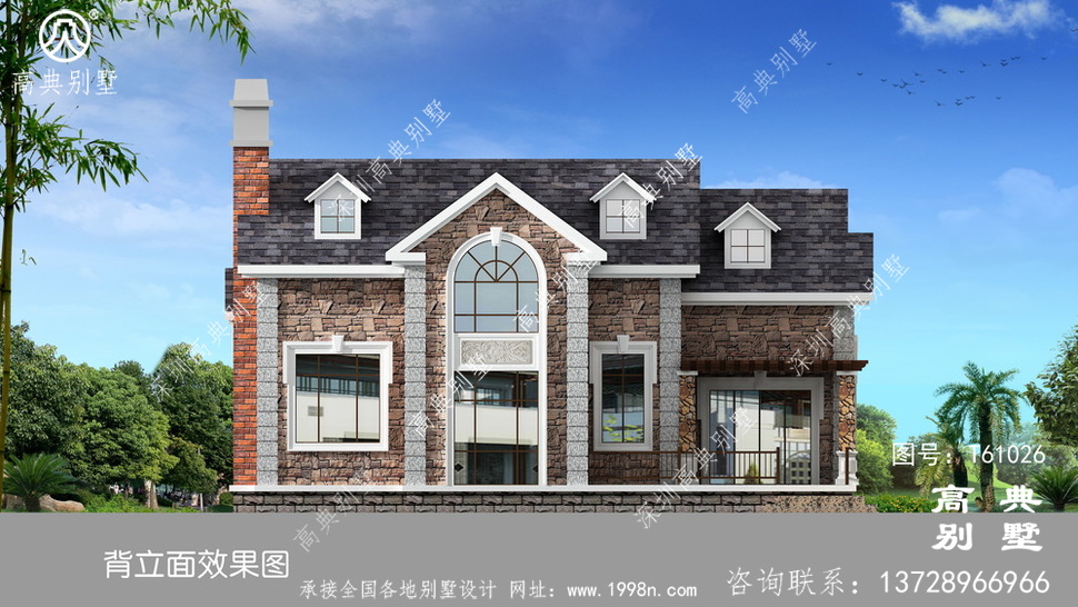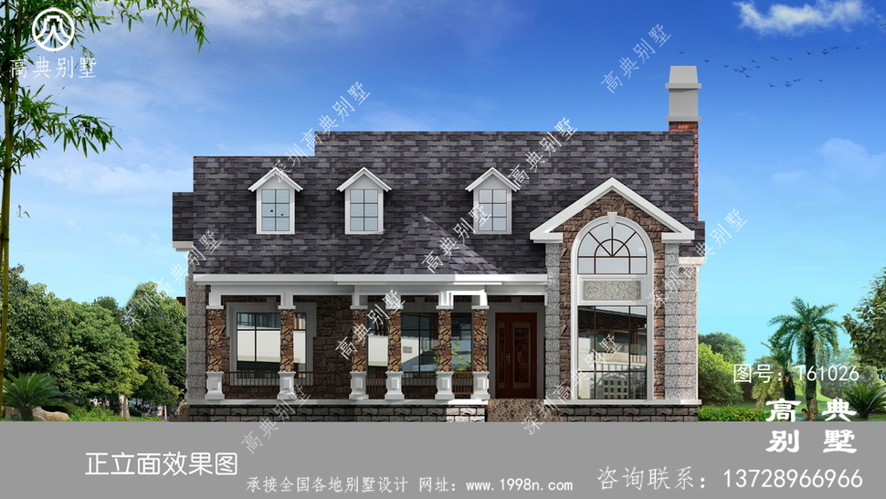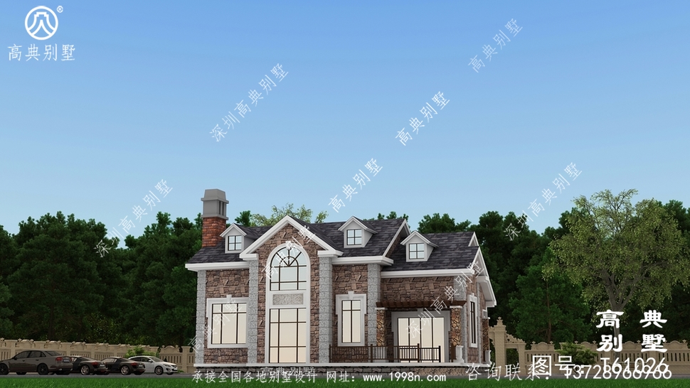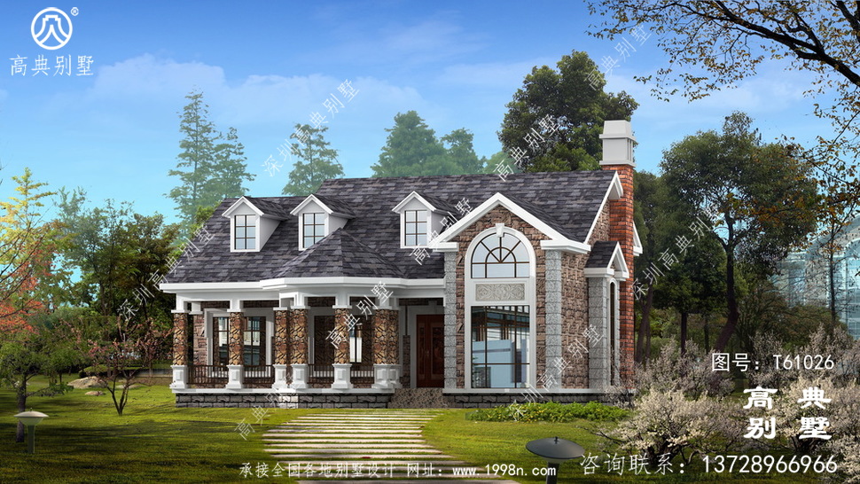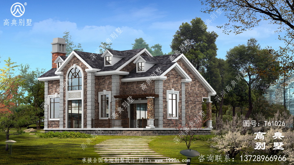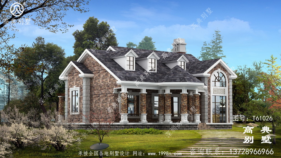 此别墅外墙主要材料:外墙文化石、屋面玻纤瓦、劈开砖、蘑菇石、火烧面麻石、外墙真石漆
