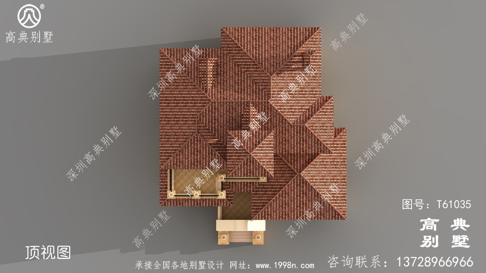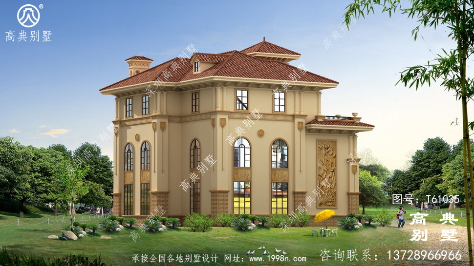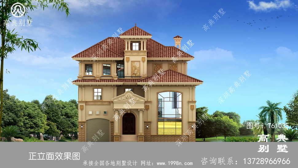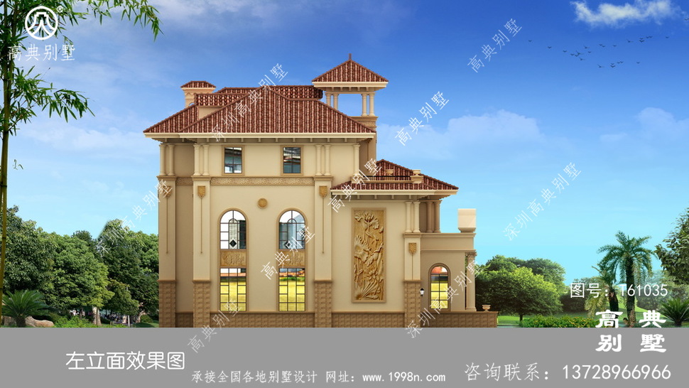 此别墅外墙主要材料:天然岩石漆、天然砂岩石板材、天然砂岩石浮雕、310X310 S瓦、GRC水泥构件、铁艺栏杆