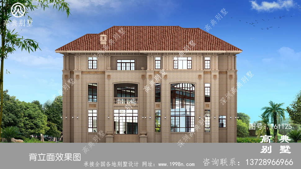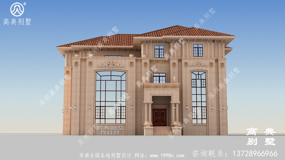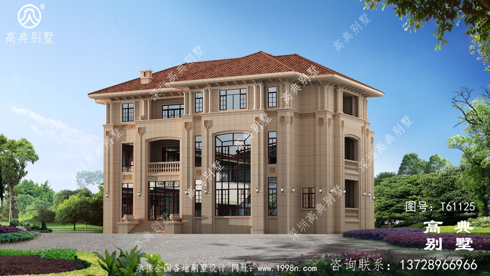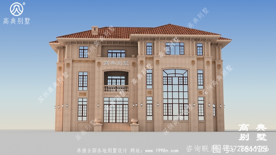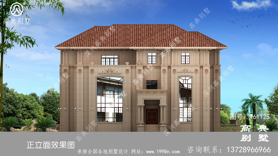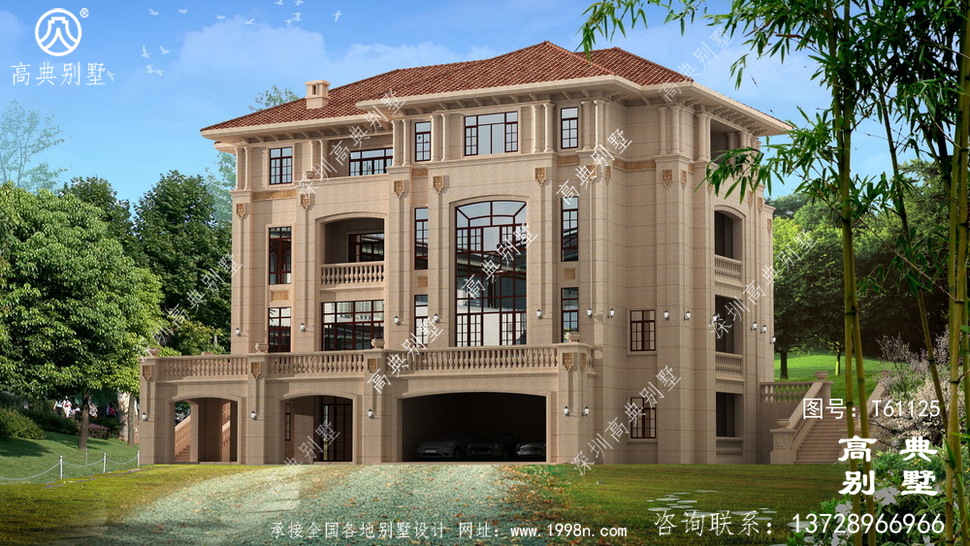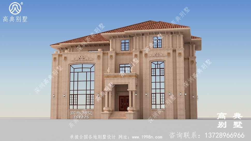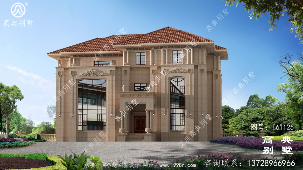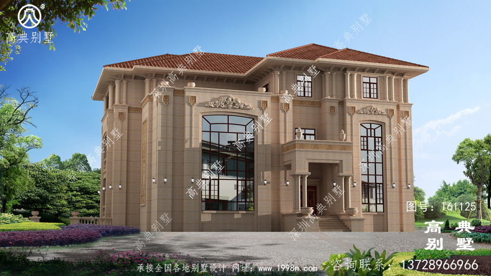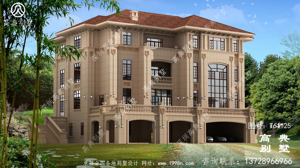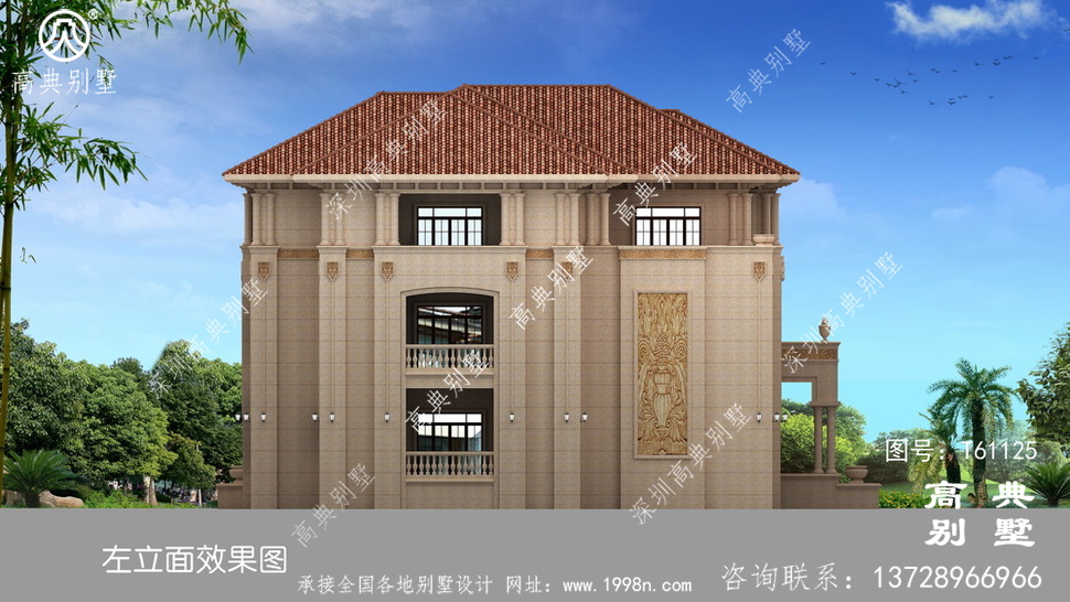 本别墅外墙全部采用福建瑕红石材干挂及天然砂岩石浮雕图案、外墙纯石材别墅、屋面用310X310 S瓦