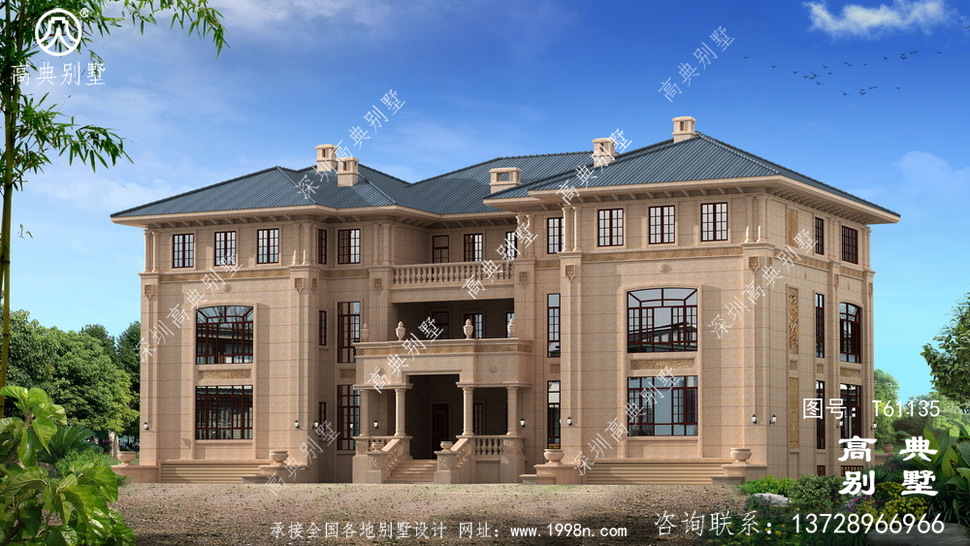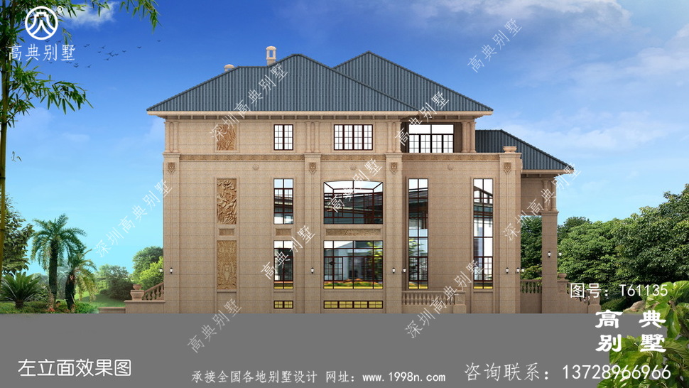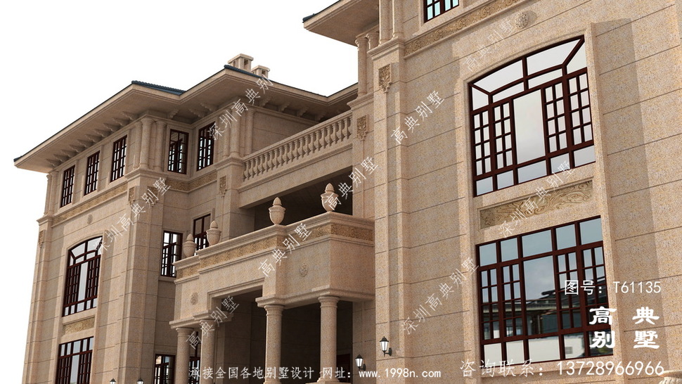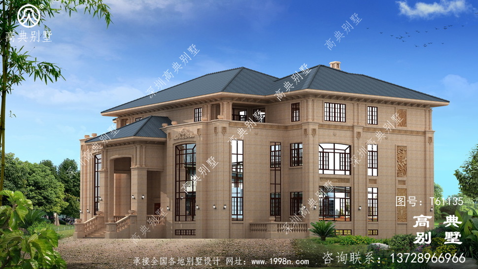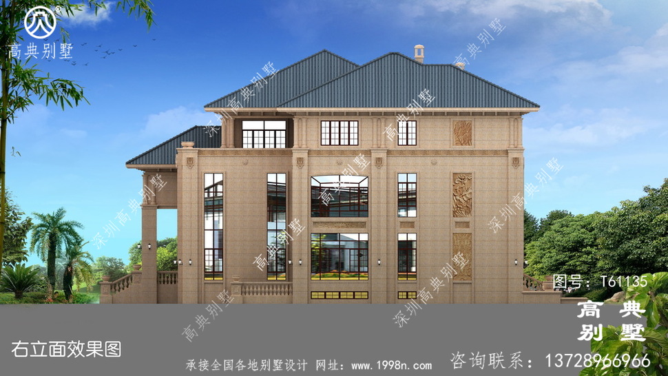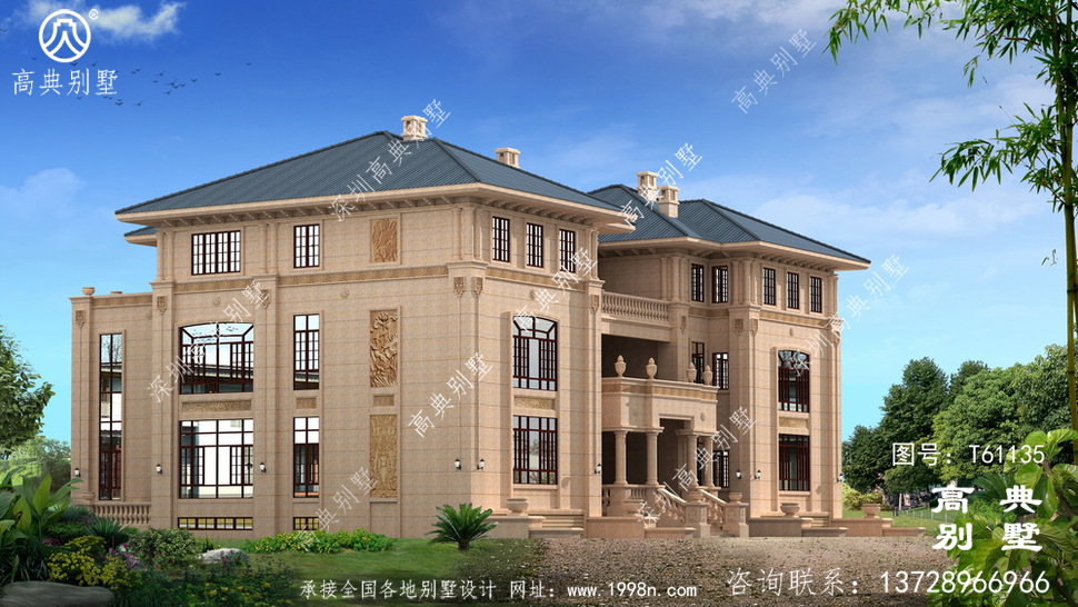 本别墅外墙全部采用沙漠棕石材干挂及天然砂岩石浮雕图案、外墙纯石材别墅、屋面用310X310 S瓦