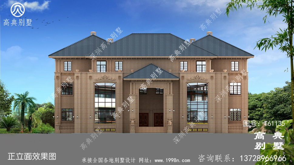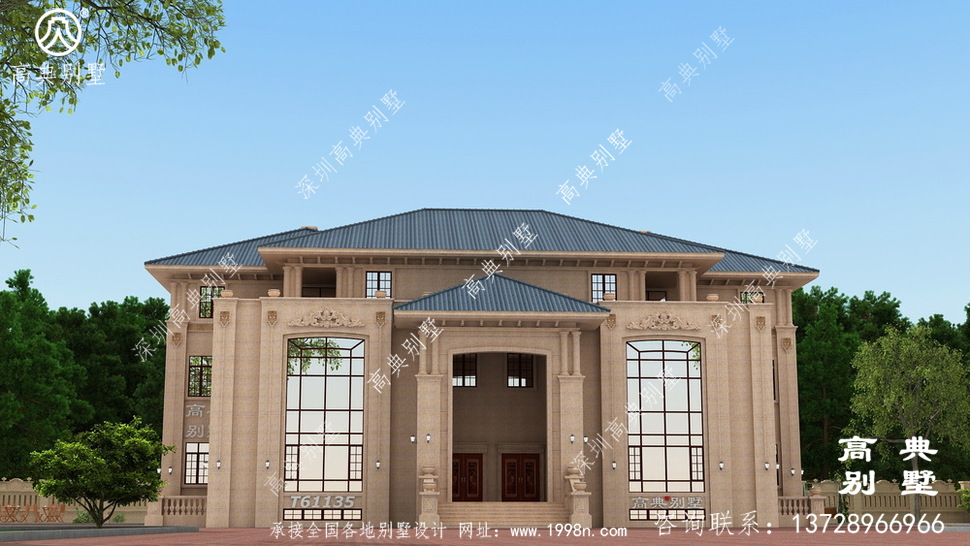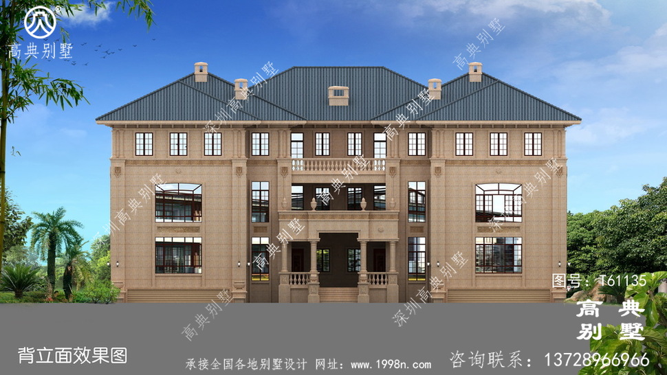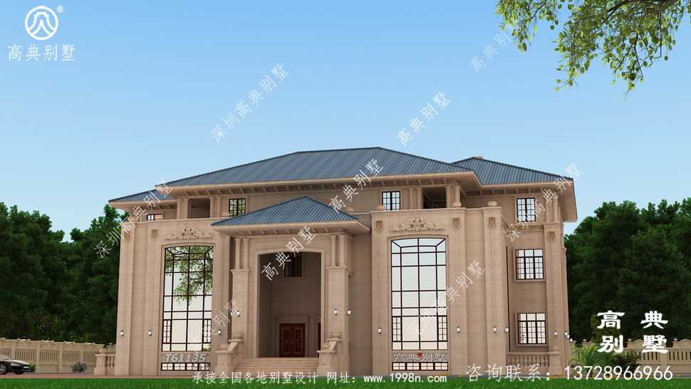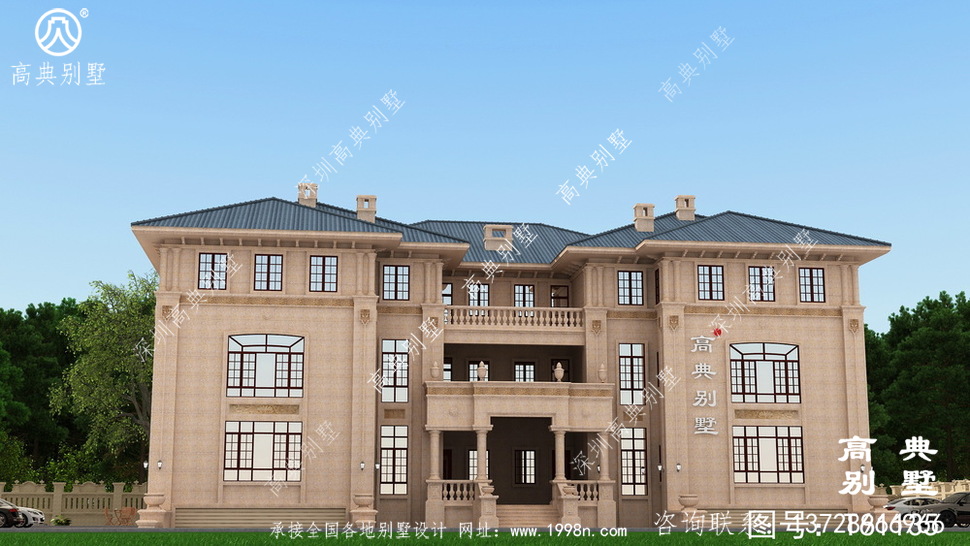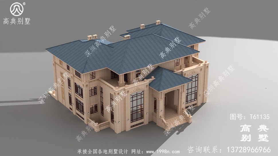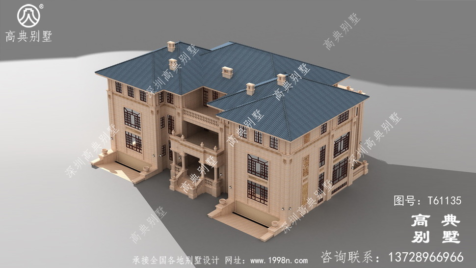 本别墅外墙全部采用沙漠棕石材干挂及天然砂岩石浮雕图案、外墙纯石材别墅、屋面用310X310 S瓦
