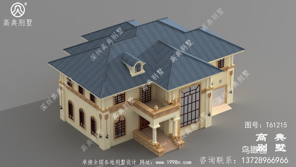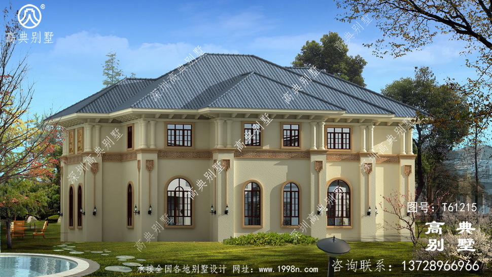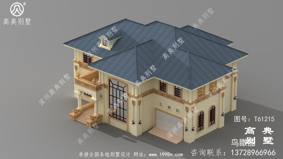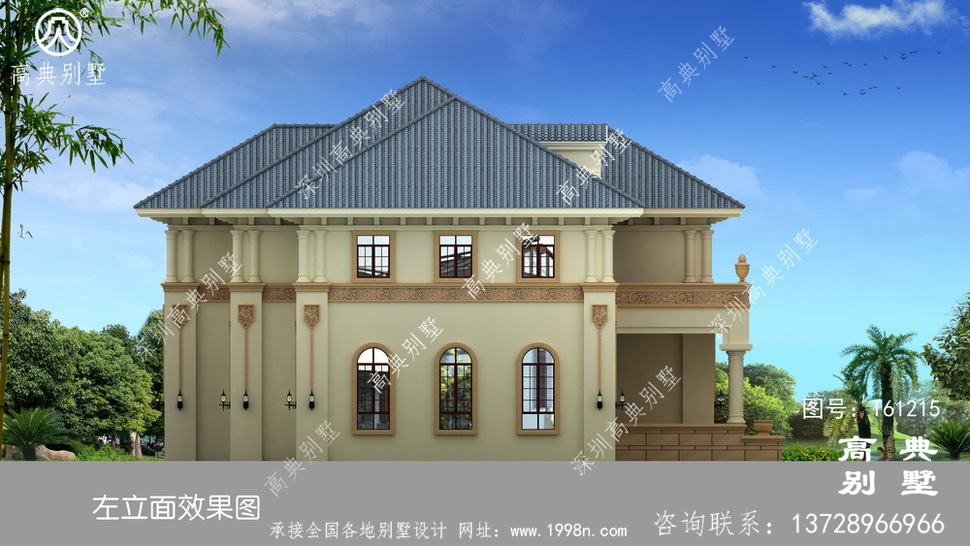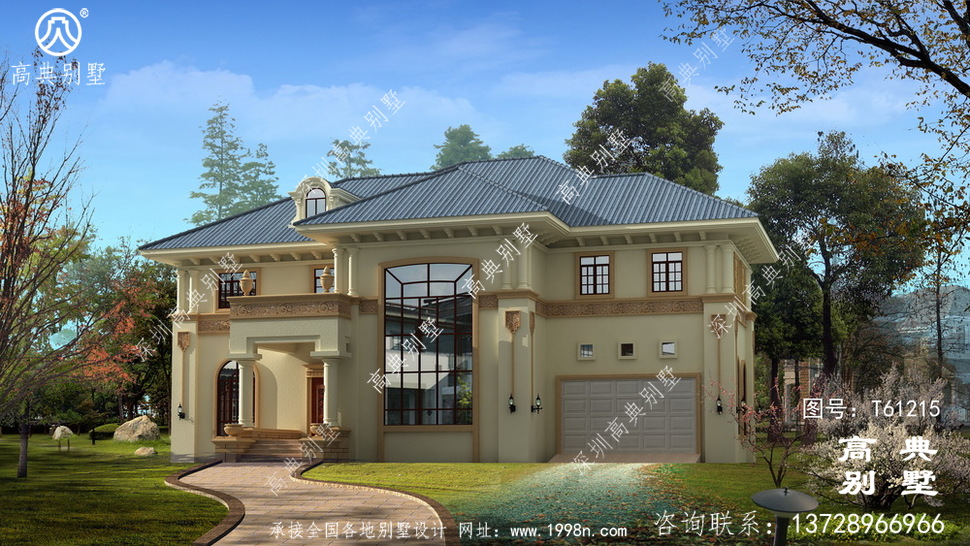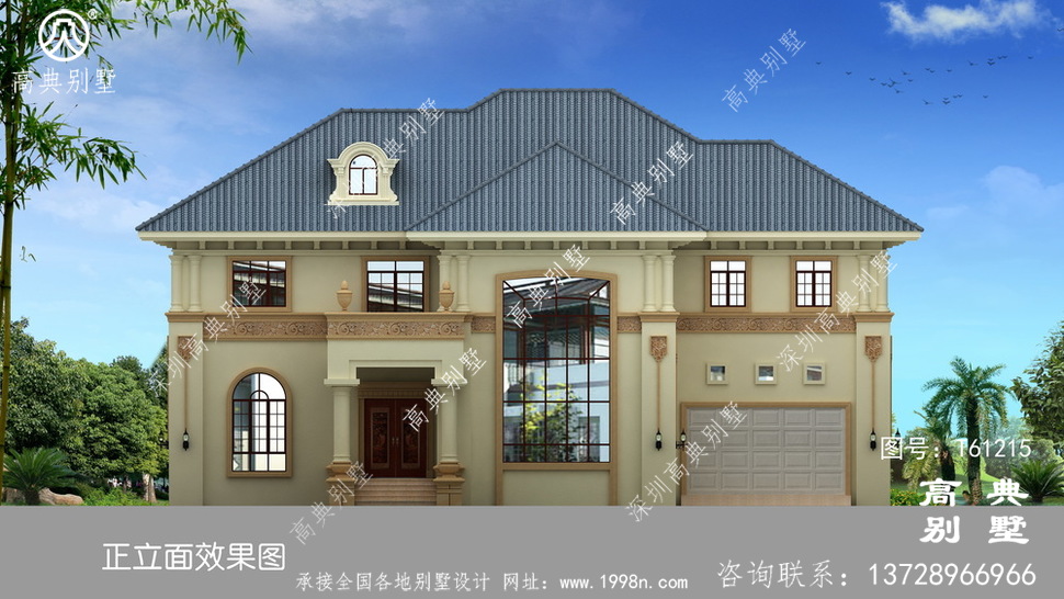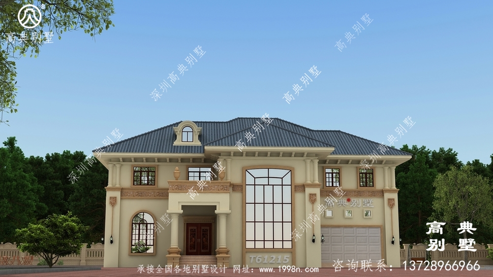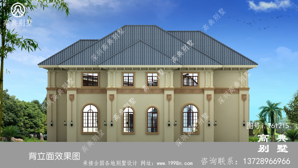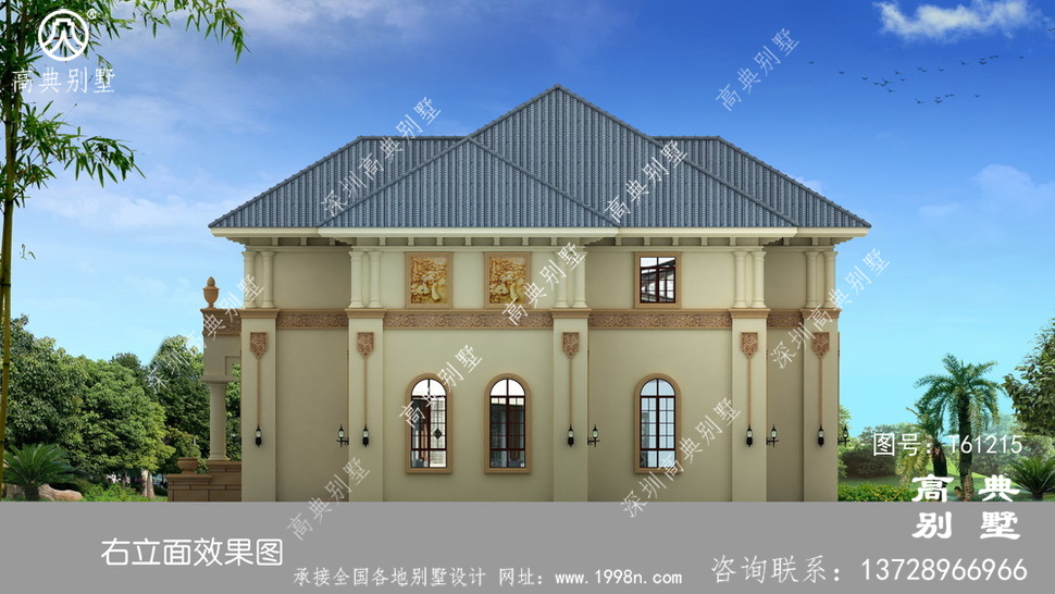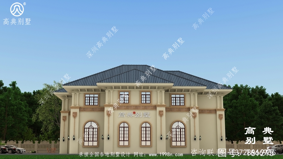 此别墅外墙主要材料:外墙涂料、GRC水泥构件、西瓦、砂岩石、砂岩石浮雕