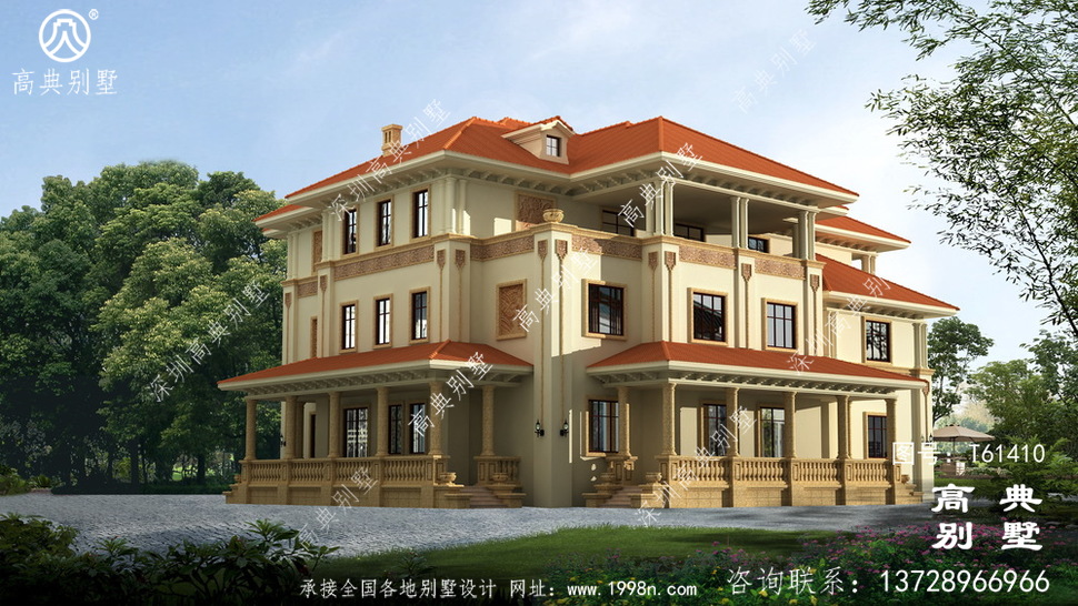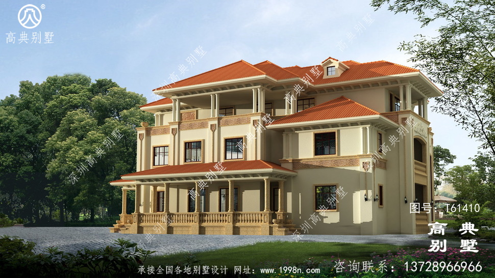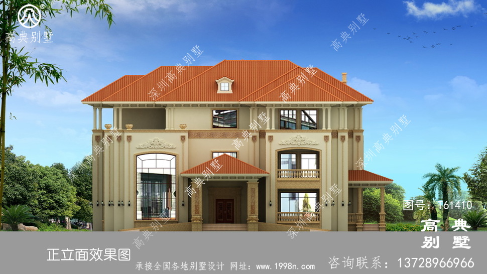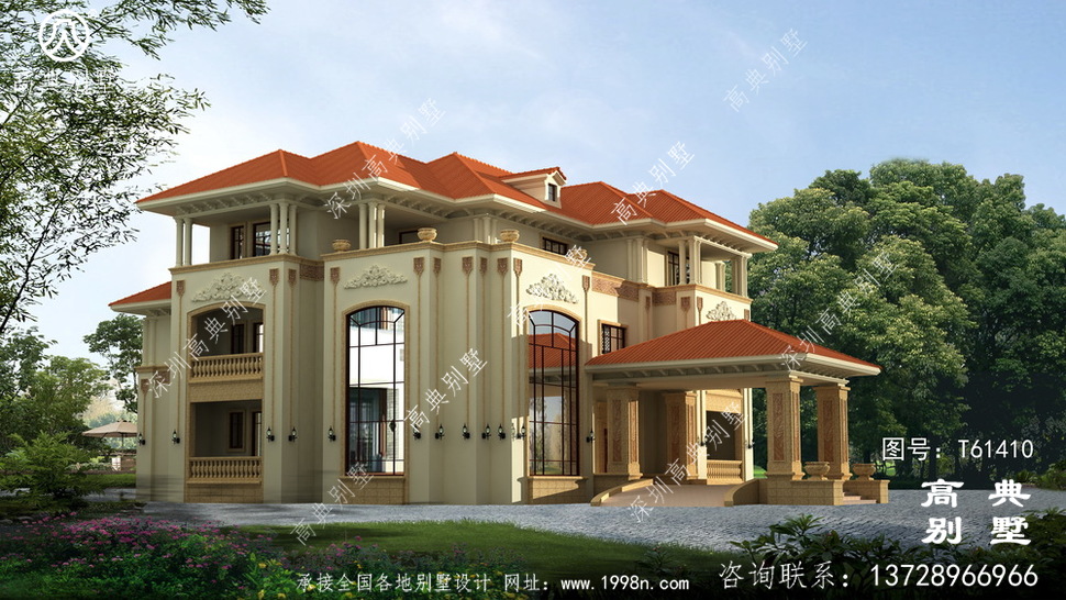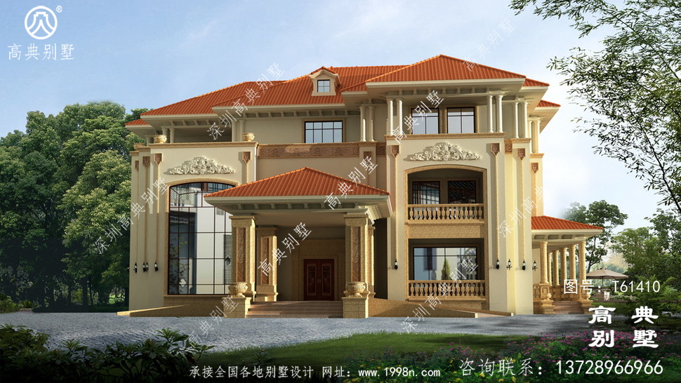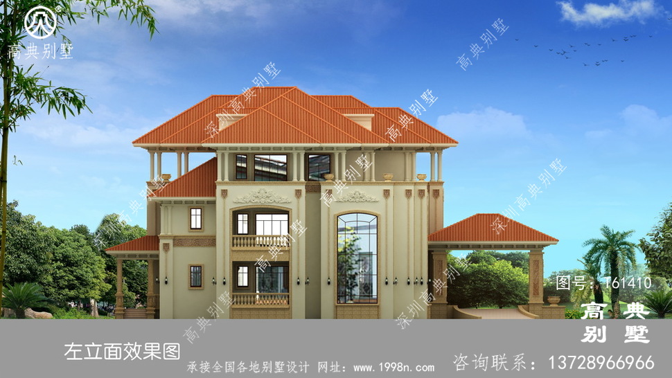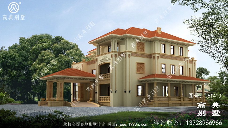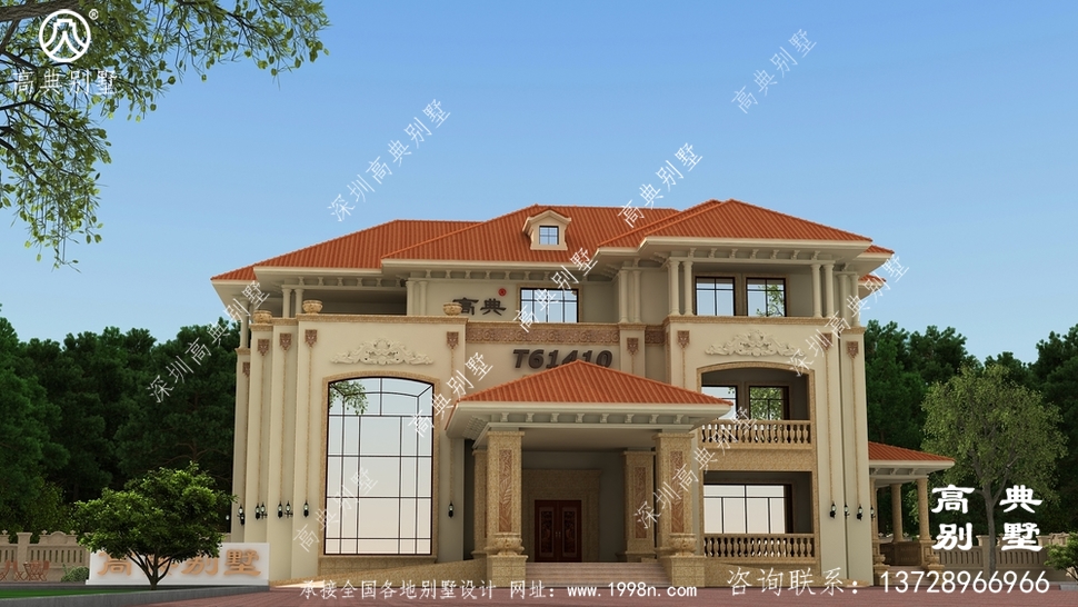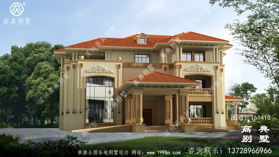 此别墅外墙主要材料:西瓦、真石漆、黄金贵花岗石、砂岩石浮雕