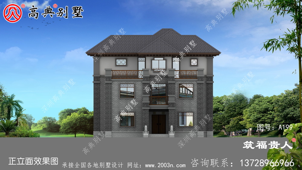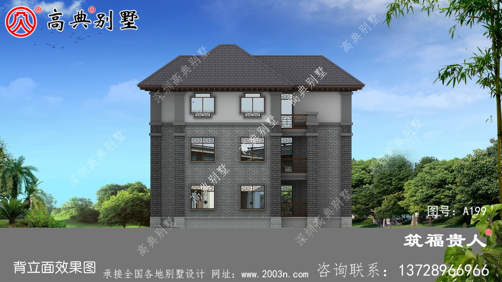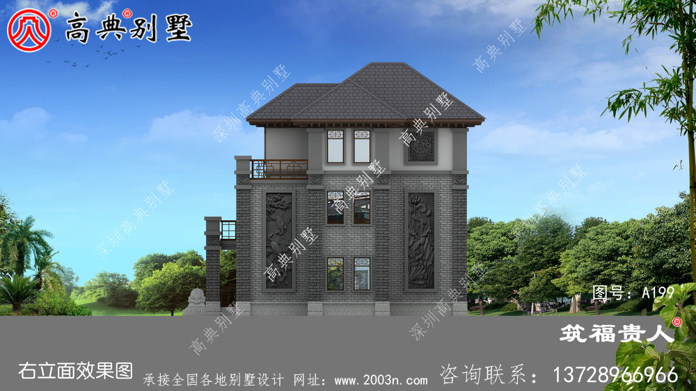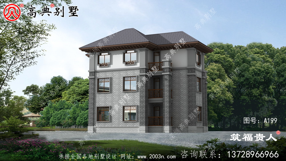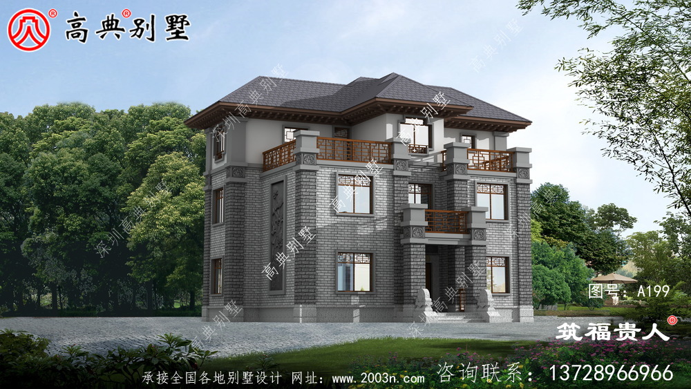 A199号别墅外墙主要材料: 水泥平板瓦、面砖、真石漆 、麻石