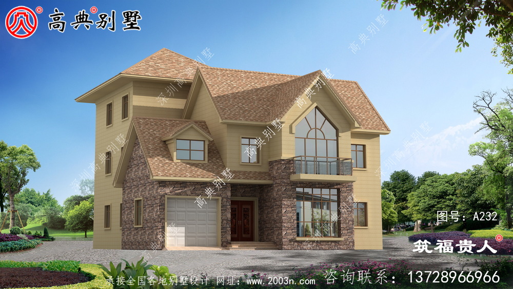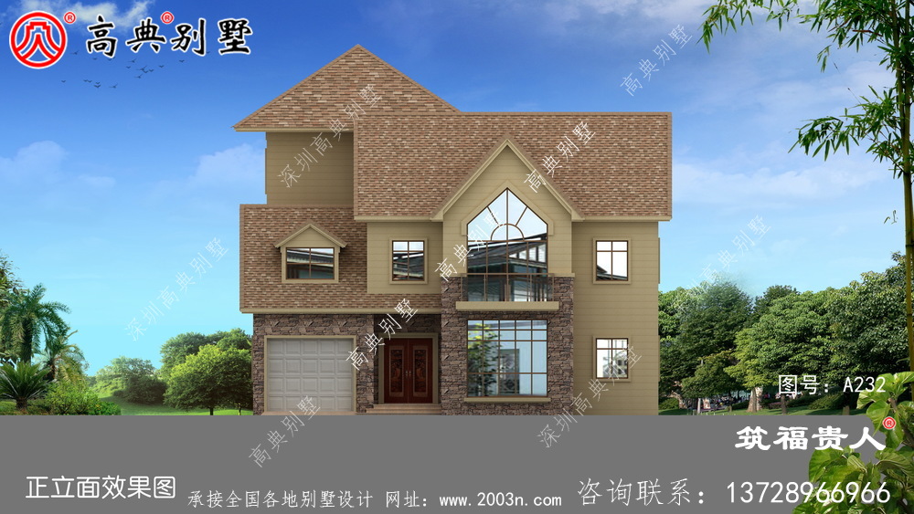 A232号别墅外墙主要材料: 真石漆、面贴文化石、水泥平板瓦、火烧面黄锈石