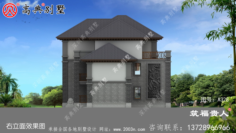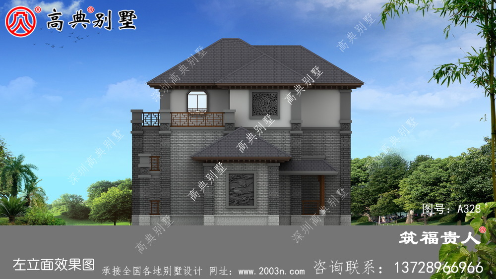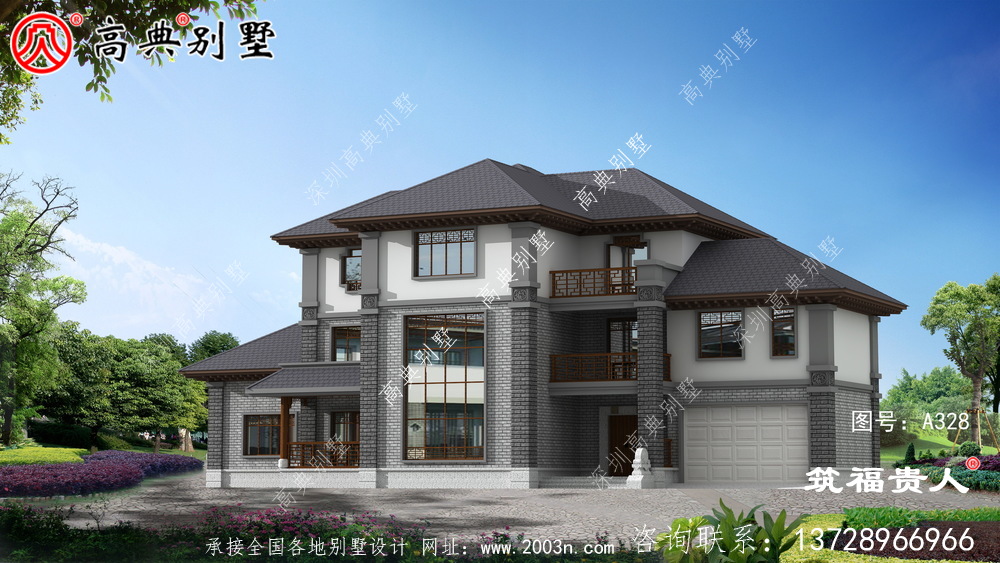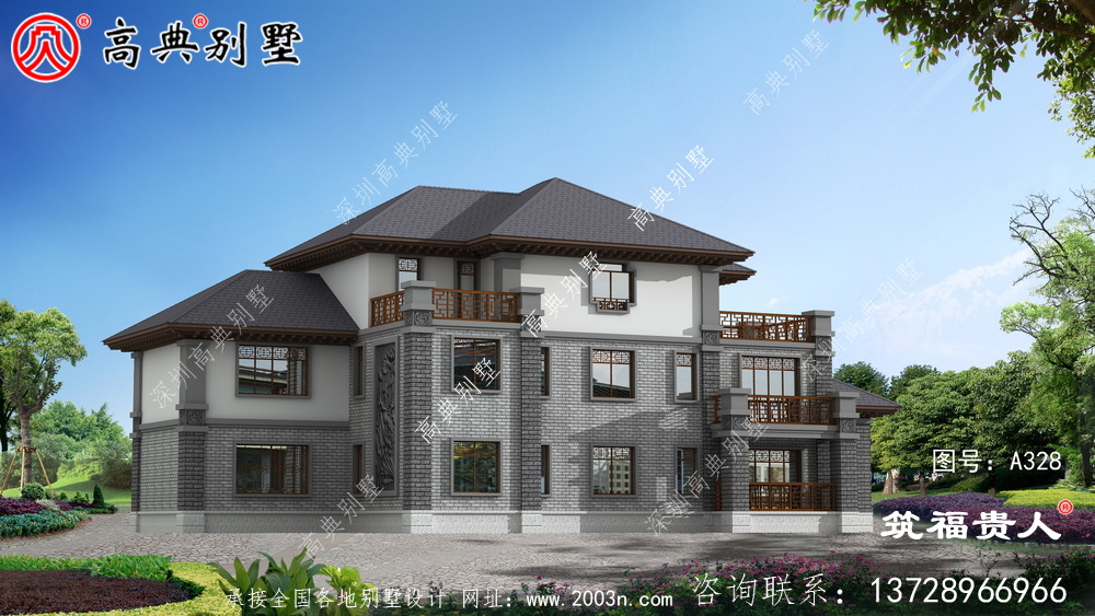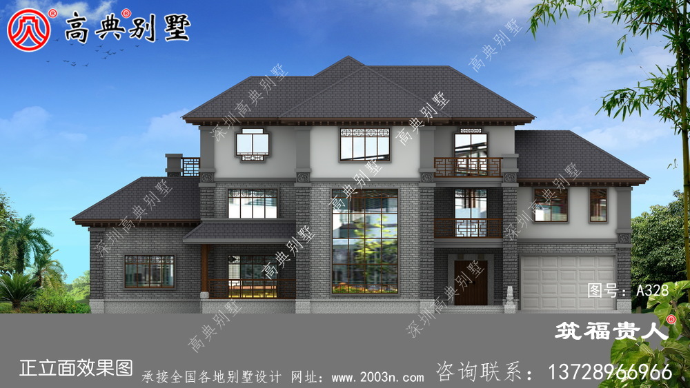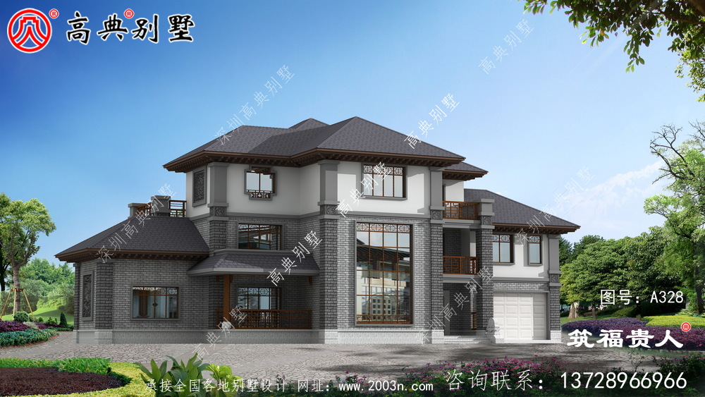 此别墅外墙主要材料:水泥平板瓦、真石漆、仿古青砖、麻石