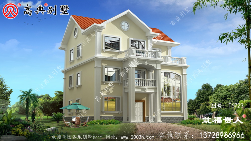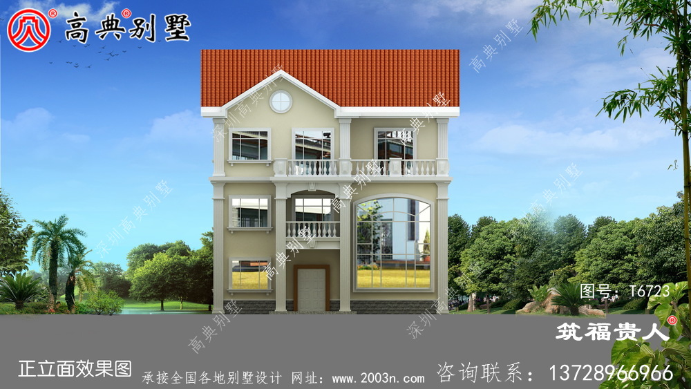 t6723号别墅外墙主要材料:外墙真石漆、S瓦、GRC水泥葫芦柱、蘑菇石